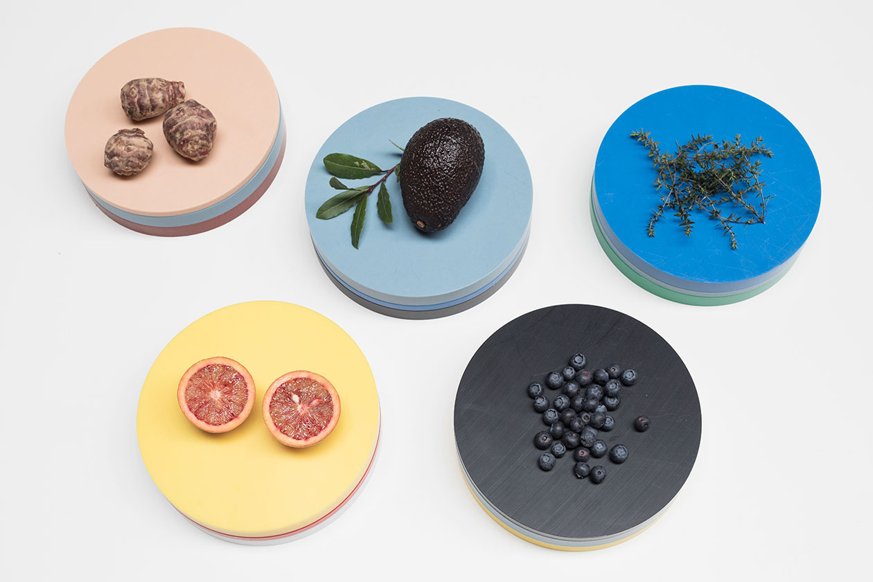Das von valerie_objects verwendete Polyethylen ist ein recht weicher Kunststoff in leuchtenden Farben, der zum Markenzeichen von Müller Van Severen wurde. Der Kunststoff wird häufig in Industrieküchen der Lebensmittelindustrie angewendet, wo es zum Schneiden verwendet wird: Rot für Fleisch, Blau für Fisch und Grün für Gemüse, um die Lebensmittelzubereitung antibakteriell zu halten.