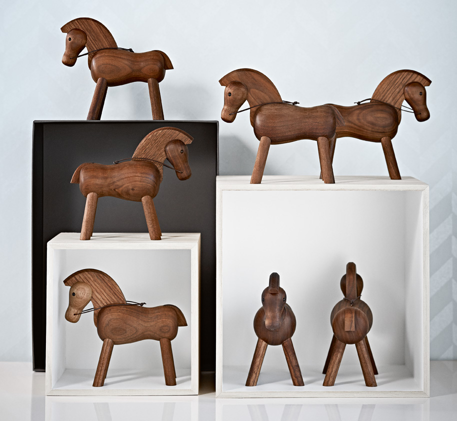 Gerade aus Dänemark angaloppiert kommt die neue Tierfigur von Kay Bojesen – die Reedition des Pferdes aus Nussbaum. Die Formgebung basiert dabei auf dem 1935 entworfenen Zebra des dänischen Kunsthandwerkers. Im Gegensatz zu dem Zebra vefügt aber ein Pferd natürlich über das passende Zaumzeug….