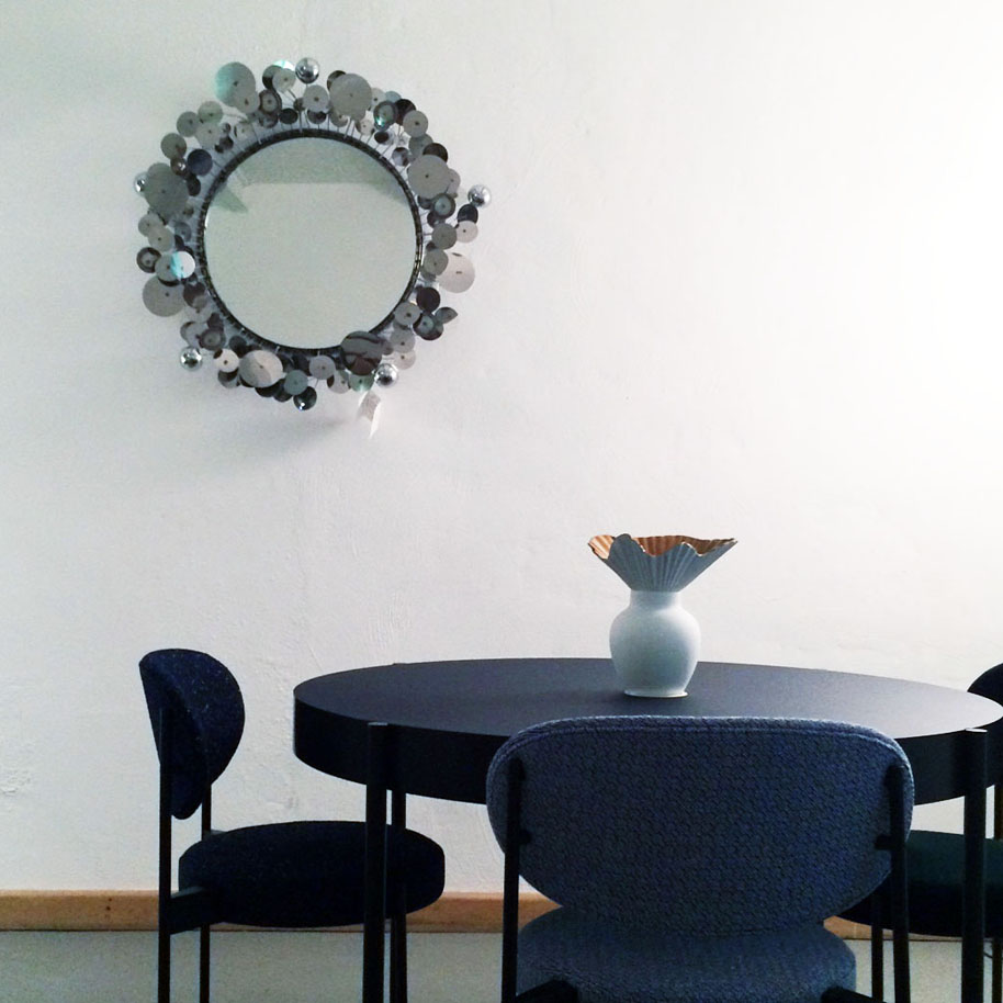 Raindrops Spiegel von Curtis Jere, Verner Panton Sitzgruppe von Verpan, die Falda Vase stammt von Sebastian Herkner für Rosenthal