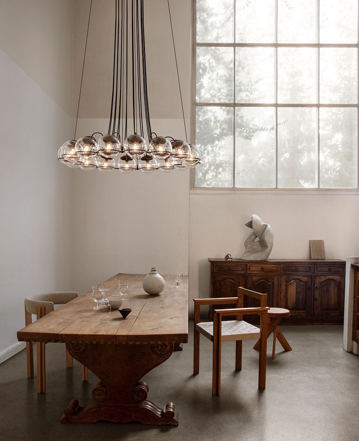 Weitere Neuheiten von astep ist die Ergänzung der berühmten Le Sfere-Glaskugelleuchtenserie um das Modell Le Sfere 2042/9 mit neun Glaskugeln. Zusätzlich sind nun auch alle Leuchten der Le Sfere-Serie wieder mit transparenten Glaskugeln erhältlich, was Gino Sarfattis Entwurf ganz andern wirken lässt (siehe Abbildung oben). Hintergrund zu der Leuchtenkollektion ist Sarfattis Liebe zum Mond. Das perfekte Licht des Mondes faszinierte den Designer, und der leuchtende Satellit mit seiner natürlichen Poesie war die wichtigste Inspirationsquelle für die Le Sfere Glaskugeln. Im Laufe der Jahre präsentierte sich das Design mit einer Vielzahl von Kombinationen und Lichtfunktionen.