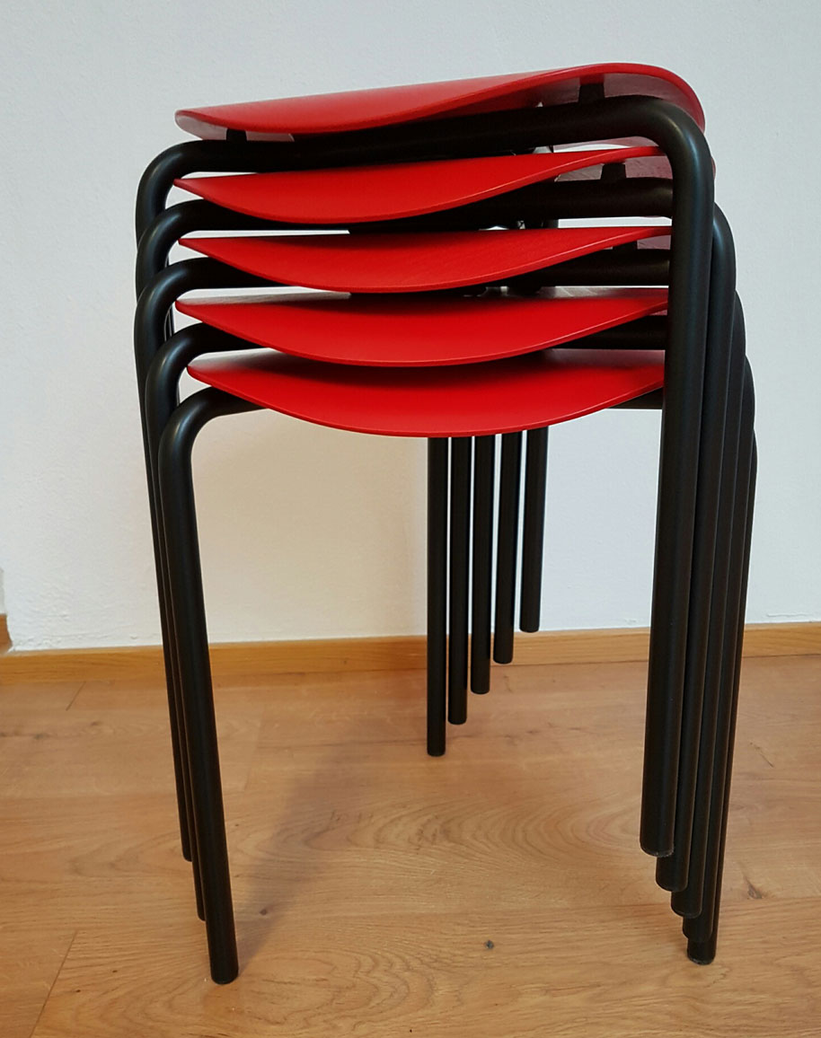 Den Namen haben wir für unsere neue Edition direkt übernommen: Lukki Hocker Amanita (abgeleitet aus dem lateinischen Amanita muscaria für Fliegenpilz). Der stapelbare Lukki Hocker besteht dabei aus schwarzem, pulverbeschichteten Stahlrohr und der rot gebeizten Formholzschichtplatte. Wir freuen uns auf Ihre Bestellung.