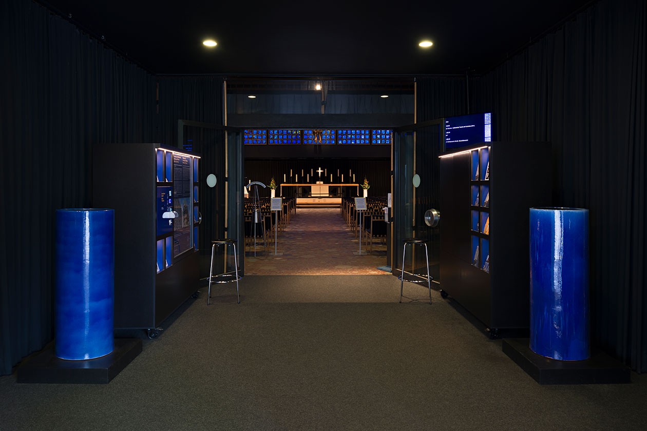 Das Foyer der Kirche erfüllt zahlreiche Aufgaben, die mit dem Empfangen von Kirchenbesuchern in Zusammenhang stehen. Während der Öffnungszeiten der Kirche sind dort ehrenamtliche Mitarbeiter anwesend, es werden Informationsmaterialien und Gesangsbücher bereitgehalten, Spenden für den Erhalt des Bauwerks entgegengenommen und die Augen der Besucher haben Gelegenheit, sich an die relativ dunklen Lichtverhältnisse im Innenraum zu gewöhnen. Im Rahmen der Umgestaltung wurde unter anderem eine digitale Spendensäule in den Raum integriert, die es erlaubt, Spenden jetzt auch bargeldlos zu tätigen. Teil der neuen Raumgestaltung, die am 16. Dezember 2021 – einen Tag vor dem sechzigsten Jubiläum der Einweihung der Kirche – der Öffentlichkeit vorgestellt wurde, sind außerdem zwei dunkelblaue Majolikavasen, die Egon Eiermann für die Gedächtniskirche entworfen hat, die aber seit langer Zeit nicht mehr öffentlich zu sehen waren. Mit einer Höhe von 140 Zentimetern und einem Durchmesser von 40 Zentimetern weisen die zylindrischen Vasen imposante Ausmaße auf und bringen die Farbtiefe ihrer Glasur hervorragend zur Geltung. In nicht allzu ferner Zukunft werden uns diese Vasen erneut beschäftigen. Seien Sie gespannt!