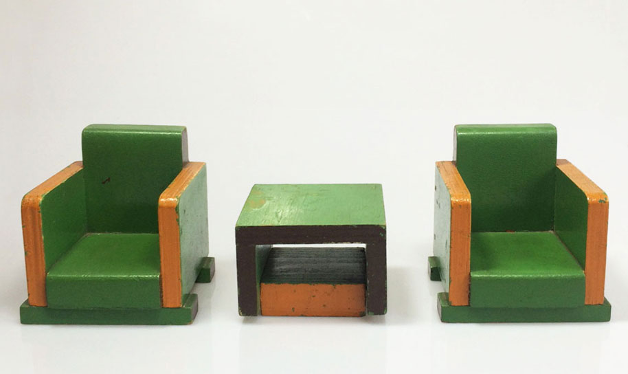 Neu in unserem Vintage-Bereich ist eine Miniaturmöbelgruppe von Ado. Die niederländische Spielzeugfirma produzierte bis 1962 zahlreiche Kinderspielzeuge in einem Design, dass sich an Arbeiten der Künstlergruppe De Stijl orientierte – besonders an den Arbeiten von Gerrit Rietveld. Designer war dabei Ko Verzuu, der diese reduzierte Sitzgruppe 1939 entwarf.