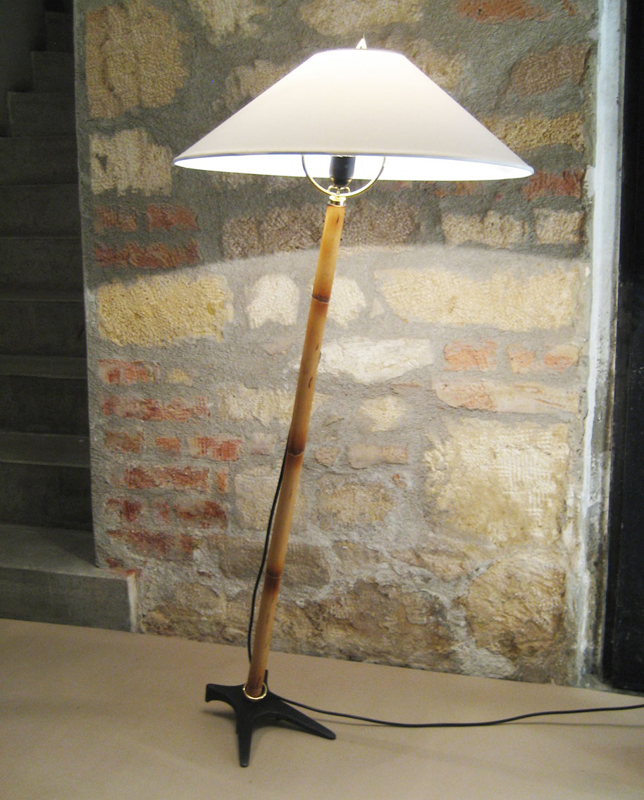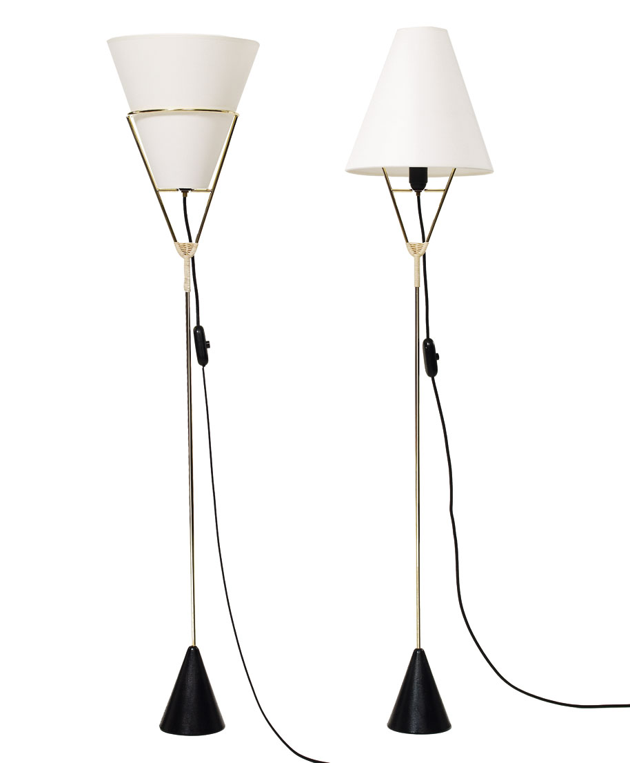 Ein schönes Beispiel für das charakteristische Auböck Design und den Mix kontrastierter Materialien ist die Schmetterling Stehleuchte, ein Entwurf aus den 1950er Jahren, die neben der außergewöhnlichen Positioniermöglichkeiten durch den Schmetterlings-Fuß, auch mit einem etwas kuriosen Materialmix daher kommt. Der Fuß ist aus Messing, der Schaft aus Bambus und der Textilschirm aus Chintz (ein Baumwollgewebe mit in einer Leinwandbindung).