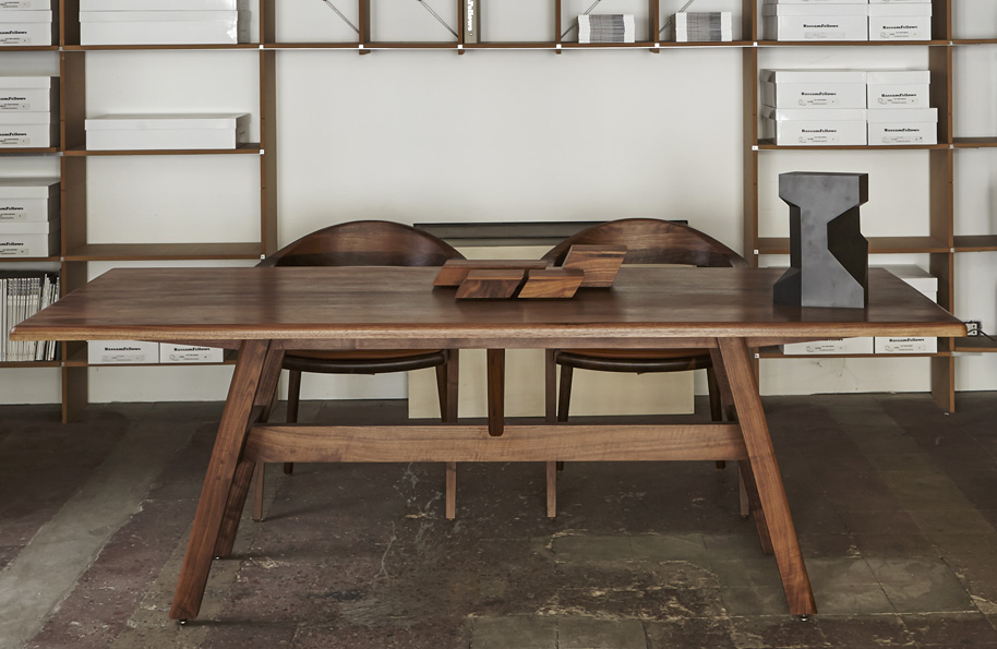 Der Kant Dining Table entstand aus der innenarchitektonischen Tätigkeit von BassamFellows als Einrichtungsobjekt für ein Haus im amerikanischen New Canaan, wo sich auch der Unternehmenssitz von BassamFellows befindet. Der im Jahr 2014 entworfene Tisch wird aus Massivholz gefertigt und zeichnet sich durch ein elegantes Gestell aus, das durch seine ausgeklügelte Statik in der Lage ist, auch schwere Tischplatten zu tragen – der Tisch ist in Längen bis zu 365 cm erhältlich. Dabei ruht das Gestell auf zwei schrägstehenden Beinpaaren, die mit einem zentralen Balken verbunden sind, auf dem die Tischplatte mit zwei zusätzlichen Streben seitlich stabilisiert wird.