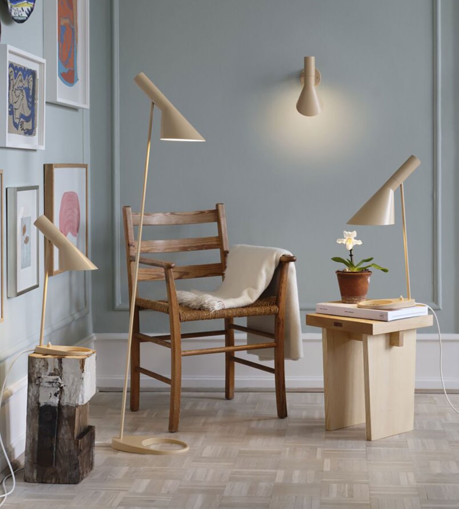 Ursprünglich umfasste die AJ Produktfamilie eine Stehleuchte, eine Wandleuchte, eine Tischleuchte und eine kleinere Tischleuchte sowie eine Tischleuchte, die zur Befestigung am Tisch gedacht war. Die Wandleuchte war reihenweise in der Hotellobby des SAS Royal zu finden und sorgte für schöne Beleuchtung und einen eleganten Touch. Die AJ Leuchte hat einen ikonischen, grafischen Ausdruck, der wunderbar zu Jacobsens Designstil passt und im Kontrast zu den organischen Formen seiner Sessel steht. Nun hat Louis Poulsen der Farbpalette der Leuchtenserie ein Update verpasst – neue sind die fünf Farben Warm Sand (Abbildung oben), Soft Lemon, Dusty Blue, und Warm Grey. Geblieben sind die Farben Schwarz, Weiß, Pale Petroleum und natürlich die Varianten in Edelstahl.