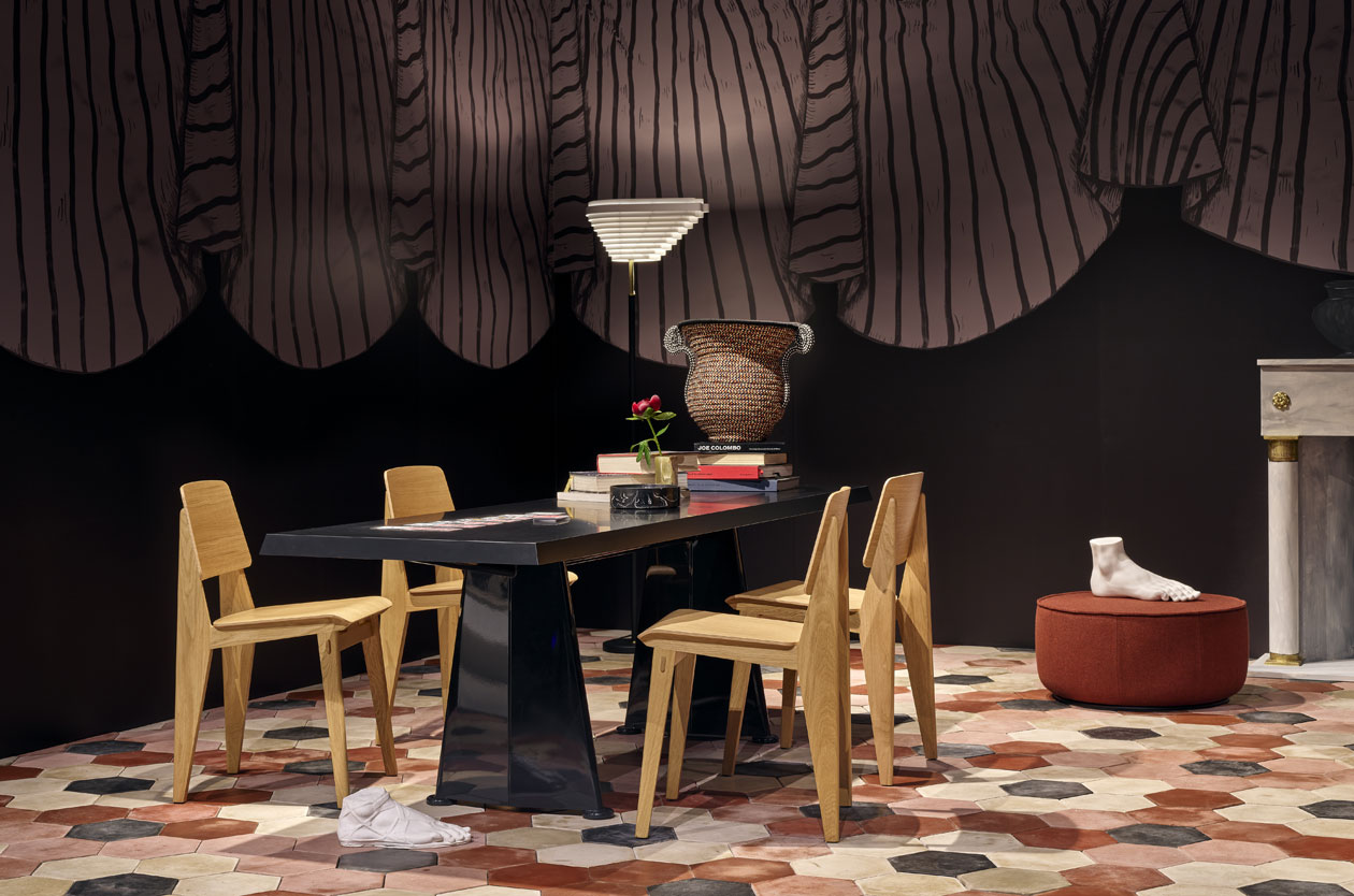 Ein Highlight der Vitra Neuheiten ist der sicherlich der Holzstuhl Chaise Tout Bois von Jean Prouvé. Der Entwurf ist eine Weiterentwicklung seines Standard Chairs aus den 1940er Jahren, wo wegen der Materialknappheit während des Zweiten Weltkriegs Prouvé Holz statt Metall verwendete. Das Besondere an dem Stuhl ist die Tatsache, dass er komplett ohne Schrauben auskommt. Die Abbildung zeigt den Chaise Tout Bois an dem Trapeze Tisch des französischen Designers und Konstrukteurs, abgerundet wird das Ensemble durch eine Artek Engelsflügel Leuchte von Alvar Aalto.