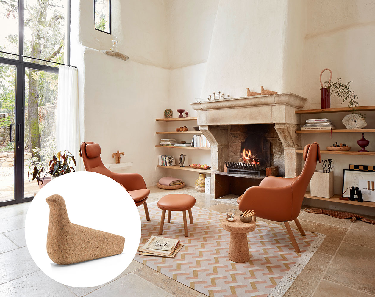 Das Material Kork verleiht der Vogelfigur eine bislang nicht erreichte optische Wärme. Der vor allem in Portugal und Spanien aus der Rinde der Korkeiche gewonnene Werkstoff besitzt eine Reihe bemerkenswerter und einzigartiger Eigenschaften. Durch seine Schaumstruktur weist Kork eine geringe Dichte und geringe Wärmeleitfähigkeit auf. Er ist zudem elastisch und wasserabweisend, was ihn zum Material für Dichtungen und Verschlüsse prädestiniert. Schon seit der griechischen Antike wird Kork genutzt um Weingefäße zu verschließen – seine bis heute wohl bekannteste Anwendung. Auch beim Bau von Musikinstrumenten kommt das Material traditionell zum Einsatz. In jüngerer Zeit wird Kork zudem als Wärmedämmstoff oder Bodenbelag auch architektonisch genutzt. Nicht zuletzt inspiriert das Naturmaterial auch immer wieder Designer zu Gebrauchsgegenständen und Möbeln. Bei Markanto finden Sie etwa Hocker nach Entwürfen der Architekten Jacques Herzog und Pierre de Meuron, sowie eine mehrere Hocker und eine Schale umfassende Serie nach Entwürfen von Jasper Morrison – letztere ebenfalls hergestellt von Vitra.