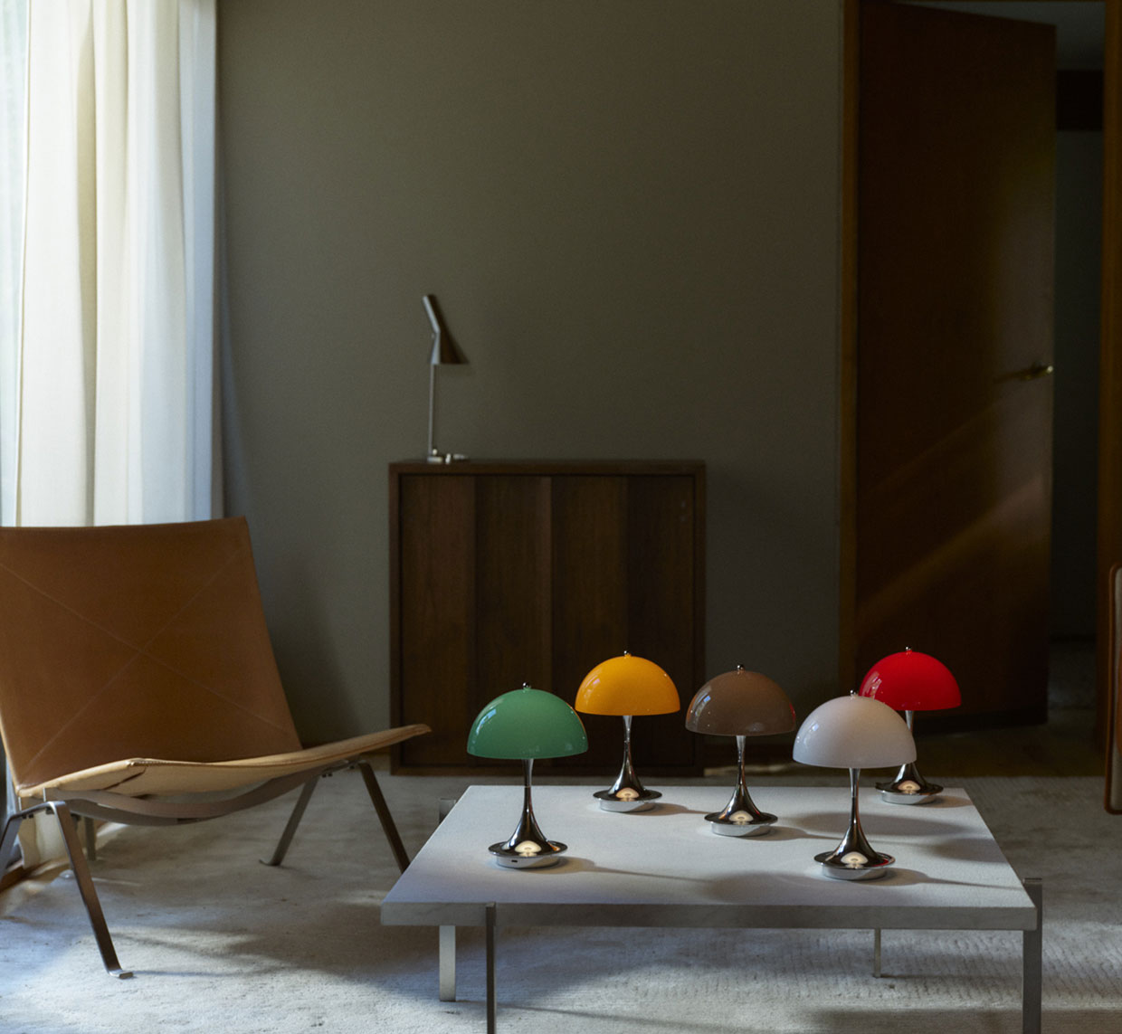 Herausgegeben zum 100. Geburtstag Verner Pantons im Jahr 2026, greift die „The Originals Edition” für die Panthella Portable 160 und 250 (im Herbst 2026 soll dann die Stehleuchte folgen) historische Farben von Verner Panton der 1970er Jahre wieder auf, die damals bei Louis Poulsen im Programm waren. Der opale Schirm in den Farben Orange, Rot, Braun, Blau-Grau und Grün, verbunden mit einem verchromten Fuß, verweist direkt auf Pantons Farbwelten und macht die Leuchte erneut zu einem farblichen Statement im Raum, ohne in Nostalgie zu verfallen. Gerade in zeitgenössischen, oft reduzierten Interieurs wirken diese Farbtöne wieder überraschend frisch und unterstreichen den skulpturalen Charakter der Form.