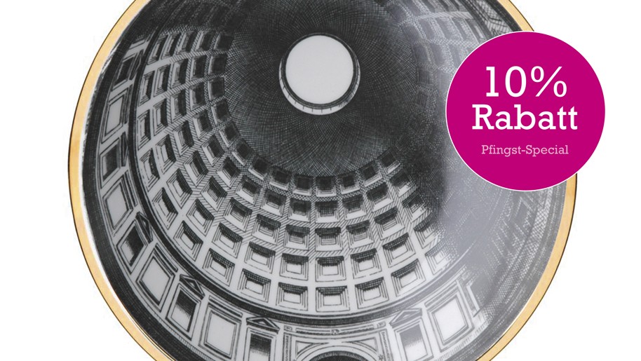 Die Abbildung zeigt passend zum Pfingst-Fest den Pantheon-Wandteller von Piero Fornasetti. Das Pantheon in Rom gilt als eines der am besten erhaltenen Gebäude der Antike und wurde um 118 bis 125 nach Christi unter Kaiser Hadrian als römischer Tempel erbaut. Seit dem Jahr 609 ist der Bau mit der größten Kuppel des Altertums eine christliche Kirche, jedes Jahr findet zu Pfingsten ein besonderes Ereignis statt: Am Pfingstsonntag regnen nach Abschluss der Messe durch die offene Kuppel der Rotunde sieben Millionen Rosenblüten auf die zahlreichen Gläubigen.