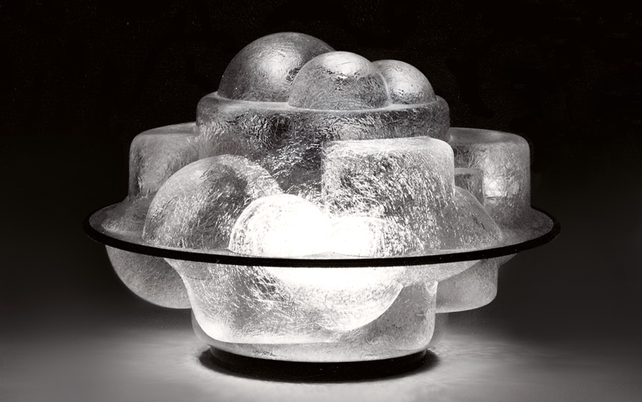 Eine der außergewöhnlichsten italienischen Leuchten der 1960er Jahre ist sicherlich Profiterolle von Sergio Asti. Ursprünglich wurde der Designkassiker 1968 für den Hersteller Martinelli luce als transparente Tischleuchte konzipiert. Der große zweiteilige Leuchtenschirm besteht dabei aus zwei identischen Schalen aus einem Fiberglas ähnlichen Material (Methacrylat-Polyester), die mittels einem Kunststoffring miteinander verbunden sind.