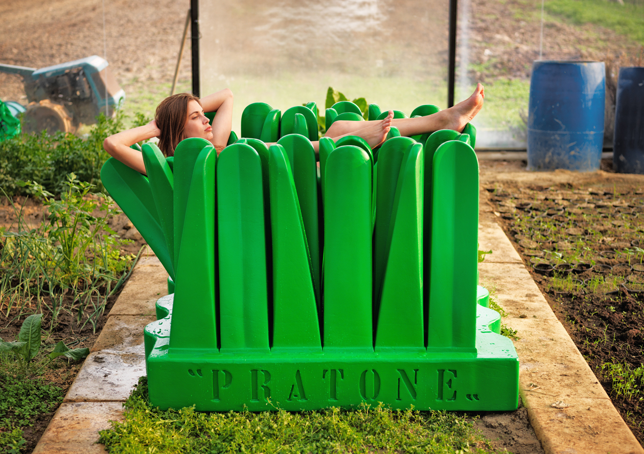 Das konzeptionell außergewöhnlichste Objekt im Sortiment von Gufram ist wohl das Sitzmöbel Pratone. Es wurde 1972 von Georgio Ceretti, Pietro Derossi und Riccardo Rosso entworfen. Der Name „Pratone“ leitet sich dabei vom italienischen Wort „prato“ ab, das „Wiese“ bedeutet. Auf einer quadratischen Grundfläche von knapp zwei Quadratmetern erheben sich übergroße synthetische Grashalme auf eine Höhe von rund einem Meter. Die Grashalme bestehen abermals aus Polyurethanschaum und sind somit weich und nachgiebig, besitzen aber auch eine gewisse Formstabilität. Das teils als Sofa, teils als Lounge-Sessel bezeichnete Möbelstück bietet dem Nutzer eine Plattform in die er sich sinken lassen kann, wobei sich die Grashalme der Körperform anpassen. Wie praktikabel oder bequem diese Lösung tatsächlich ist, entscheiden Sie am besten selbst. Wie so viele Entwürfe des Radical Design ist auch Pratone mehr Statement als Möbelstück.