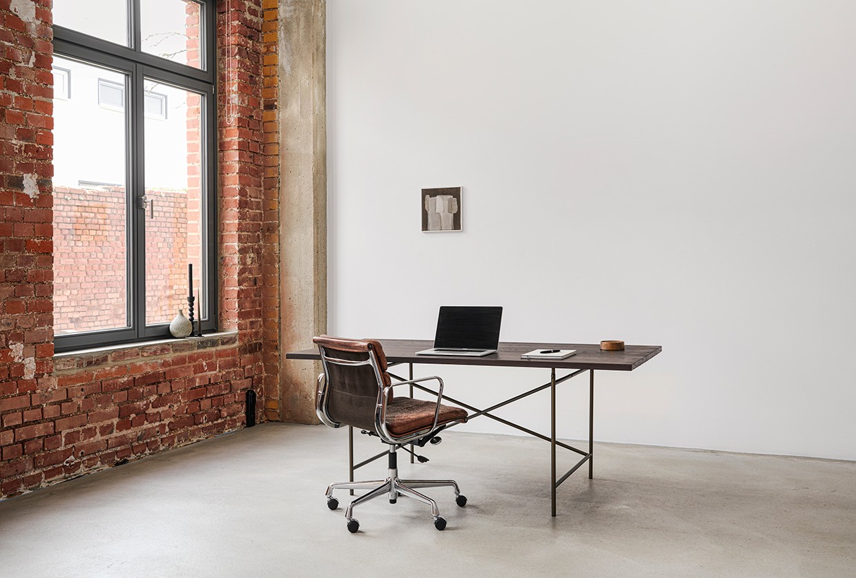 Tim Schütze ist ein junges Gestaltertalent, das durch die handwerkliche Metall- und Holzbearbeitung sowie das künstlerische Schaffen innerhalb der Familie sehr früh Zugang zur Kreativität fand. 1997 in Hamburg geboren und in der Nähe aufgewachsen, absolvierte er zunächst ein Bachelor of Arts-Studium in Industrial Design an der Hochschule für Technik und Wirtschaft Berlin und befindet sich derzeit im Abschluss seines Masterstudiums am Institut für Design & Social Context der Universität der Künste Berlin. Allerdings kam – eher unerwartet – etwas dazwischen: Er erhielt in einem Technologie-Seminar die Aufgabe, ein Möbelkonzept basierend auf Bewegungsmechanismen zu entwickeln. Inspiriert von der Funktionsweise von 3D-Druckern, die die Druckebene mithilfe von Spindeltrieben verstellen, kam dem Liebhaber des Eiermann Tischgestells die Idee, die Ikone mit einer ähnlichen Mechanik an zeitgenössische Ansprüche eines Arbeitstisches anzupassen. „Ich habe mich nicht von der ‚Aura‘ des Eiermann 1 Tischgestells einschüchtern lassen“ so Tim Schütze über seine Arbeit.