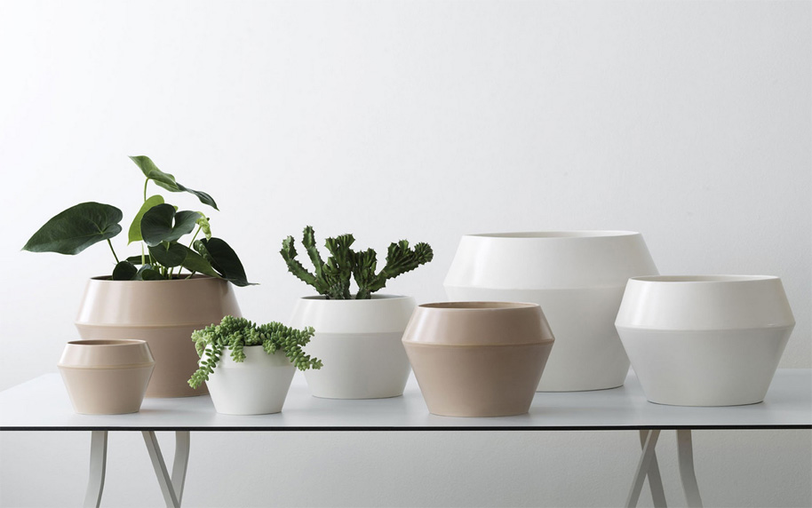 Der Name ist hier Programm, ist doch das zentrale Gestaltungsmerkmal dieser Serie ein umlaufender, mittlerer Rand, der die Keramiken in verschiedenen Höhen gliedert. Zusammen mit den unterschiedlichen Durchmessern von Oberkante, Unterkante und mittlerem Rand und der Höhe der Objekte ergibt sich so ein klares, aber vielseitiges Spiel der Verhältnisse untereinander – besonders Reizvoll ist dieses natürlich in Gruppen mit mehreren verschiedenen Vasen und Töpfen.