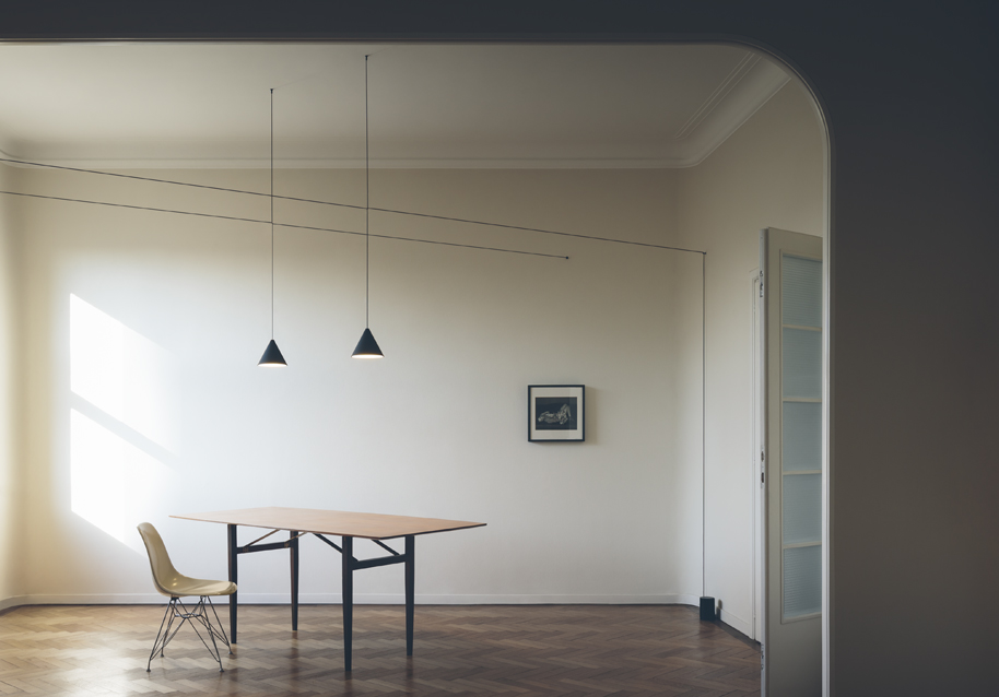 Der in London lebende Designer über seinen Entwurf für Flos: "Wenn ich mit dem Zug reise, sehe ich beim Blick durchs Fenster immer die langen Stromleitungen. Die Art und Weise, wie sie die Strommasten verbinden, ist so schön und so voller Poesie, obwohl sie dabei auch eine Trennlinie durch die Landschaft zeichnen. Diesen Effekt wollte ich in der Innenarchitektur wiedergeben."