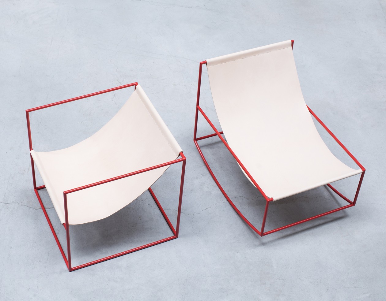 Nachdem der Duo Seat innerhalb kürzester Zeit Ikonenstatus erlangte, ergänzten Muller und Van Severen die Kollektion nun um zwei Sessel, die demselben Konstruktionsprinzip folgen. Da ist einerseits der annähernd würfelförmige Solo Seat und andererseits der Rocking Chair, der nicht nur eine etwas horizontalere Sitzposition aufweist, sondern durch die konvexe Ausformung der unteren Rahmenrohre auch als Schaukelstuhl funktioniert. Neu gegenüber dem Duo Seat ist auch die Verwendung einer Lederbahn anstatt des ursprünglichen Leinentuchs. Hierfür wurde ein ungefärbtes Leder gewählt, dass über die Zeit nachdunkelt und eine schöne Patina entwickelt. Die meisten Varianten bietet dabei der Rocking Chair; er ist nicht nur wahlweise auch mit dem bewährten Leinentuch erhältlich, sondern wird auch mit einem Gestell angeboten, das anstatt aus robustem pulverbeschichtetem Stahl aus unbehandeltem Messing besteht und so seinen ganz eigenen schroffen Charme verbreitet.