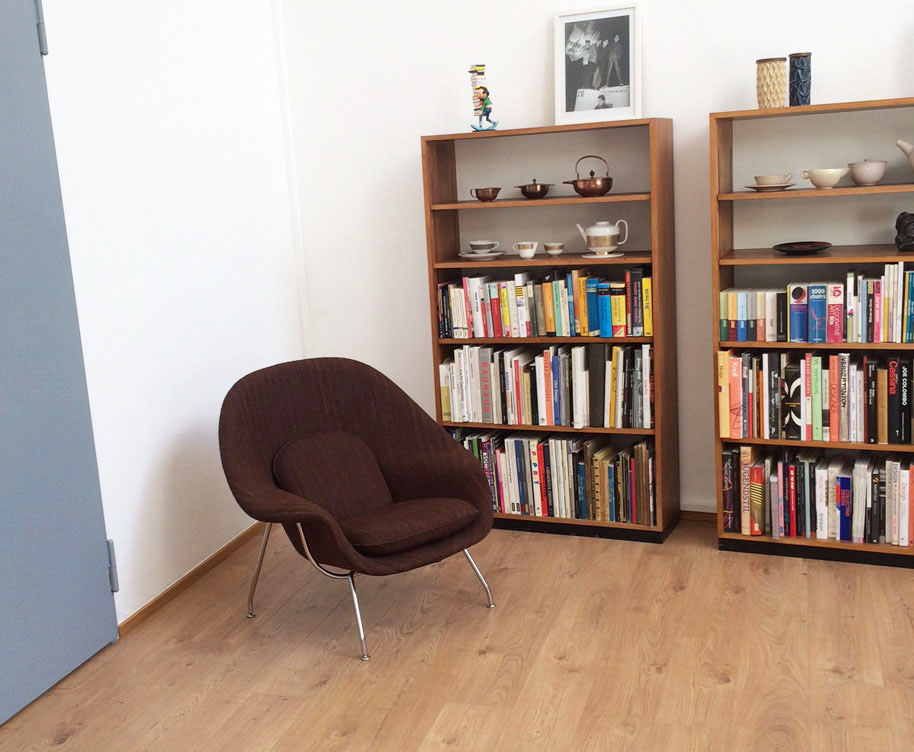 Unsere Bibliothek mit demn beiden original Marcel Breuer Regalen und passend dazu ein Womb Chair