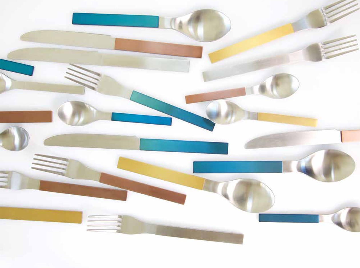 Den besonderen Clou erhalten die Besteckteile in einem zweiten Produktionsschritt. Um einen dickeren Griff zu erhalten, und ihm somit eine angenehmere Haptik zu verleihen, wird im Griffbereich ein zusätzliches Stück Edelstahl aufgesetzt. Die Nahtstelle bleibt dabei erkennbar und macht die Konstruktionsweise ablesbar. Mehr noch: Anstatt nur in rohem Edelstahl, sind die Besteckteile auch mit Griffaufsätzen aus beschichtetem Edelstahl erhältlich. Die Beschichtungen bringen Farbe ins Spiel. Sie sind in blauer Farbe, Kupfer oder Messing erhältlich, wobei die Kupferbeschichtung als braun, und die Messingbeschichtung als gelb erscheint. Allen drei Beschichtungen ist ein metallischer Glanz gemein. Um die Beschichtung auf den Edelstahl zu bringen kommt das technisch anspruchsvolle PVD-Verfahren zum Einsatz. Die Abkürzung steht für Physical Vapour Deposition und lässt schon erahnen, wie das Verfahren funktioniert. Das Beschichtungsmaterial wird verdampft und mittels elektrischer Ladung gezielt dazu gebracht, auf dem Trägermaterial zu kondensieren. Mit diesem Verfahren sind besonders dünne und ebenmäßige Beschichtungen möglich.