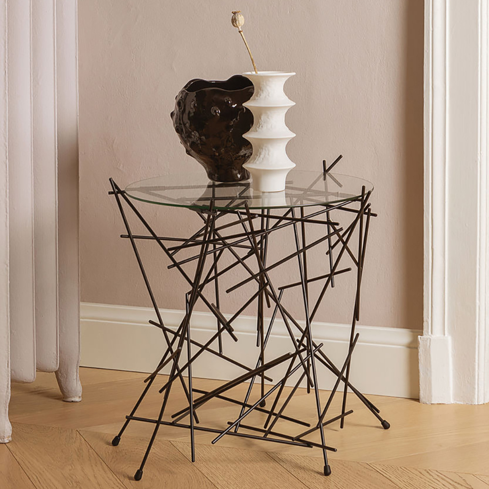 Der hier Beistelltisch der Serie Blow Up entstand 2006 für Alessi, die Lösung in Form von zusammengeschweißten Edelstahl-Stäben ist typisch für die Kreativität der Brasilianer Fernando und Humberto Campana und wurde bereits mehrfach ausgezeichnet. Seit 2023 ist der Tisch auch mit schwarzem Gestell bei Alessi erhältlich.