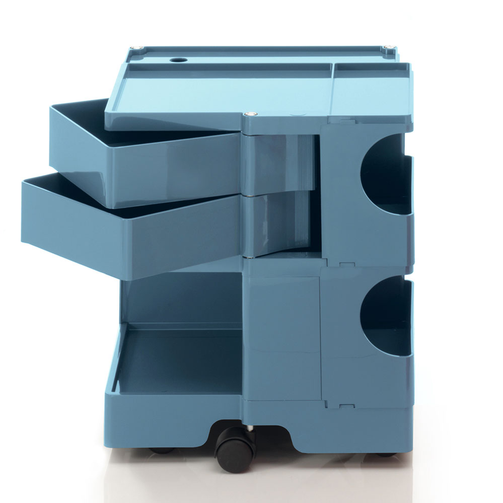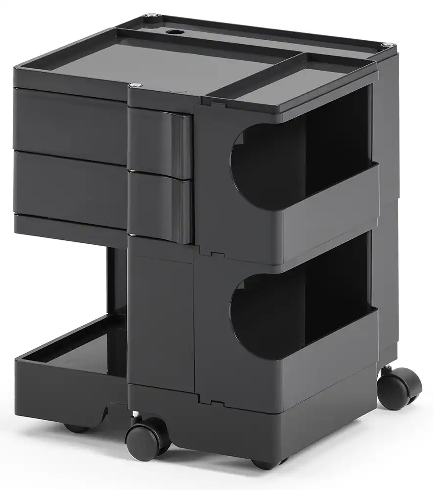 Der Rollcontainer Boby ist Joe Colombos erfolgreichster und sicherlich bekanntester Entwurf. Die heutige Version des italienischen Designklassikers wird von B-Line in Italien produziert. Der Boby war Vorbild für eine ganze Generation von Rollcontainern und zählt zur ständigen Sammlung des Museum of Modern Art in New York. Der Entwurf stammt dabei aus dem Jahr 1970. Gefertigt wird der rollbare Aufbewahrungscontainer aus glänzendem ABS-Kunststoff, fünf Rollen sorgen für die von Joe Colombo gewünschte Mobilität.