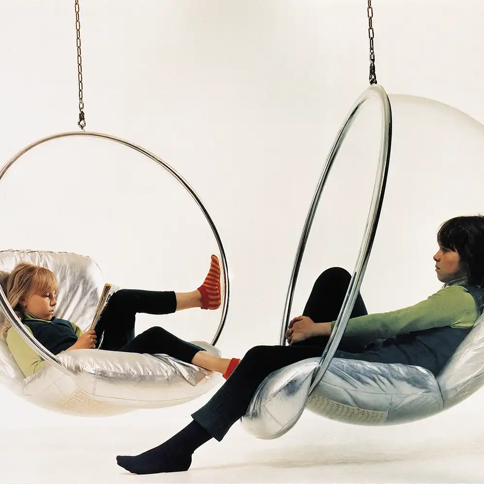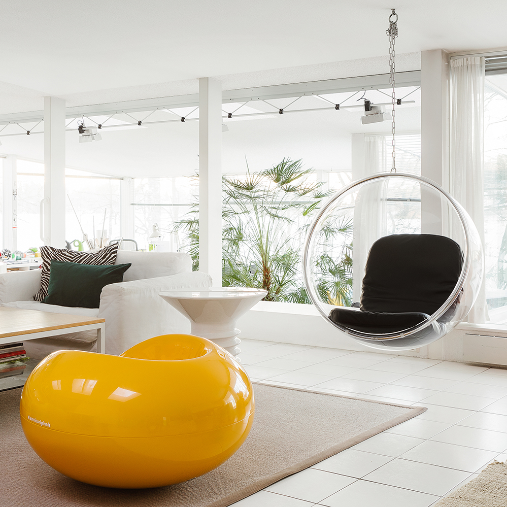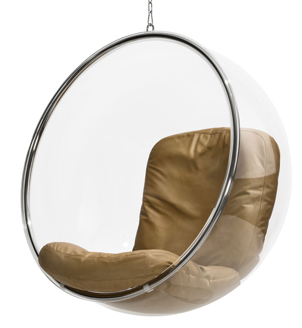 Der Hängesessel Bubble Chair von Eero Aarnio ist sicherlich zusammen mit dem Ball Chair eines der bekanntesten Sitzmöbel der 1960er Jahre. Der kugelförmige, transparente Bubble Chair aus Acrylglas wird mittels einer Metallkette an die Decke montiert.