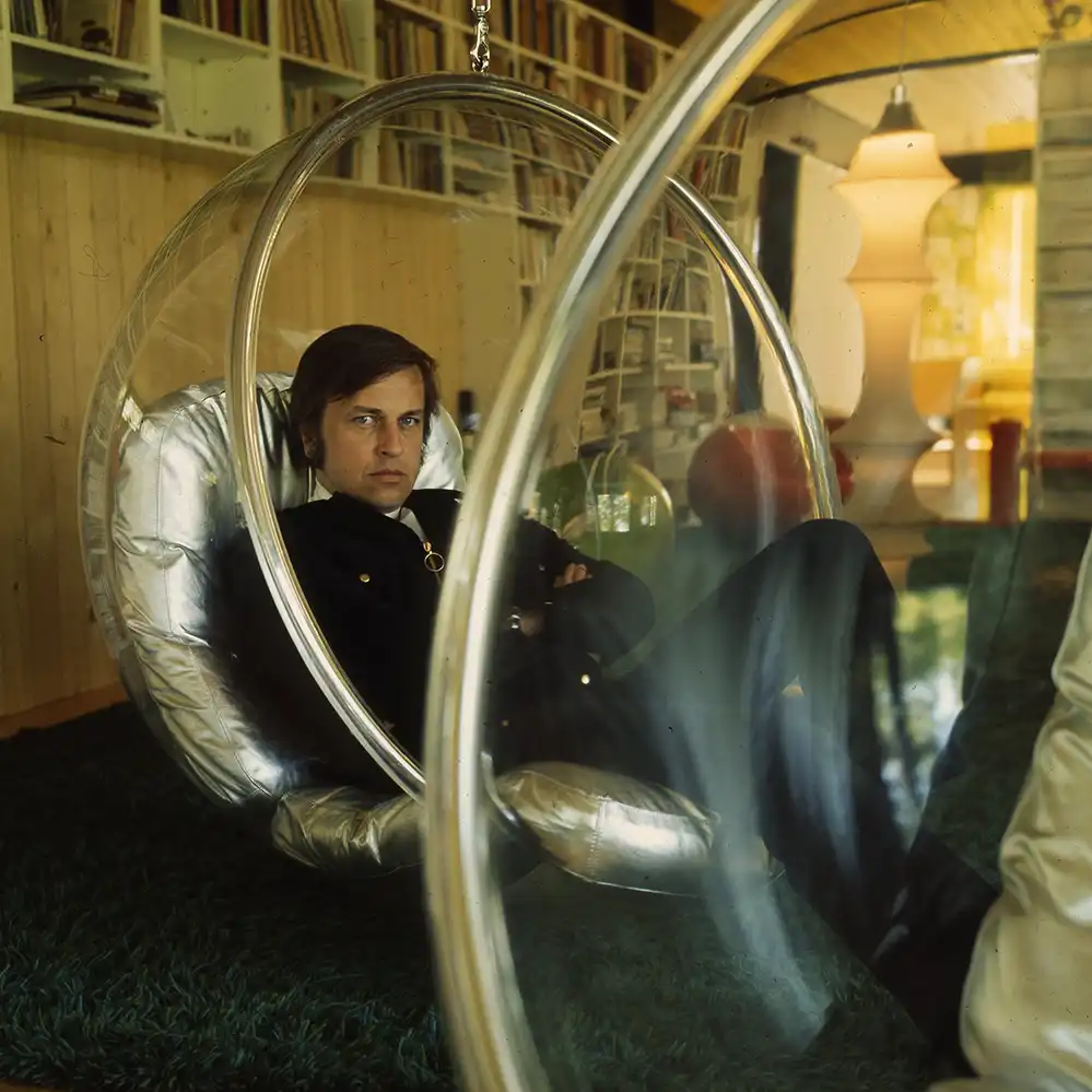 Eero Aarnio studierte an der Hochschule für Kunst und Gestaltung in Helsinki unter Ilmari Tapiovaara. Zu Beginn der 1960er Jahre begann Aarnio mit neuen Werkstoffen zu experimentieren, welche ihm ganz neue Gestaltungsformen ermöglichten. Heraus kam zuerst der aus Fiberglas bestehende legendäre Ball Chair mit seiner einzigartigen Formgebung – kurze Zeit später dann der Bubble Chair. Das letzte Foto zeigt übrigens den jungen collen Aarnio in seinem Entwurf, die beiden missmutig schauenden Teenager sind hingegen seine Töchter.... Damals wurde halt noch die Familie als Fotomedelle genutzt.