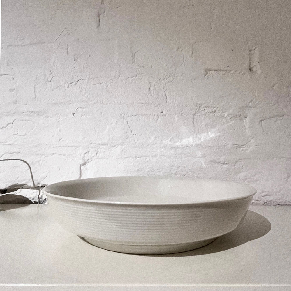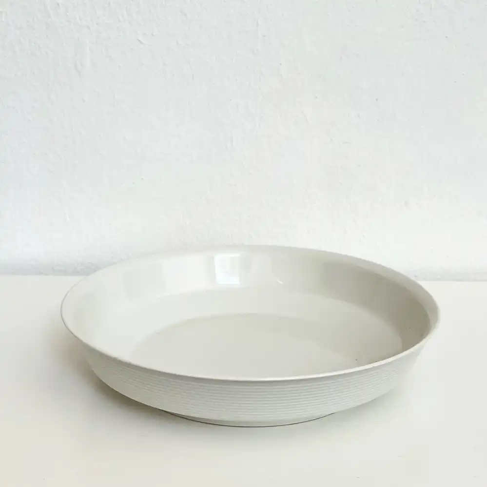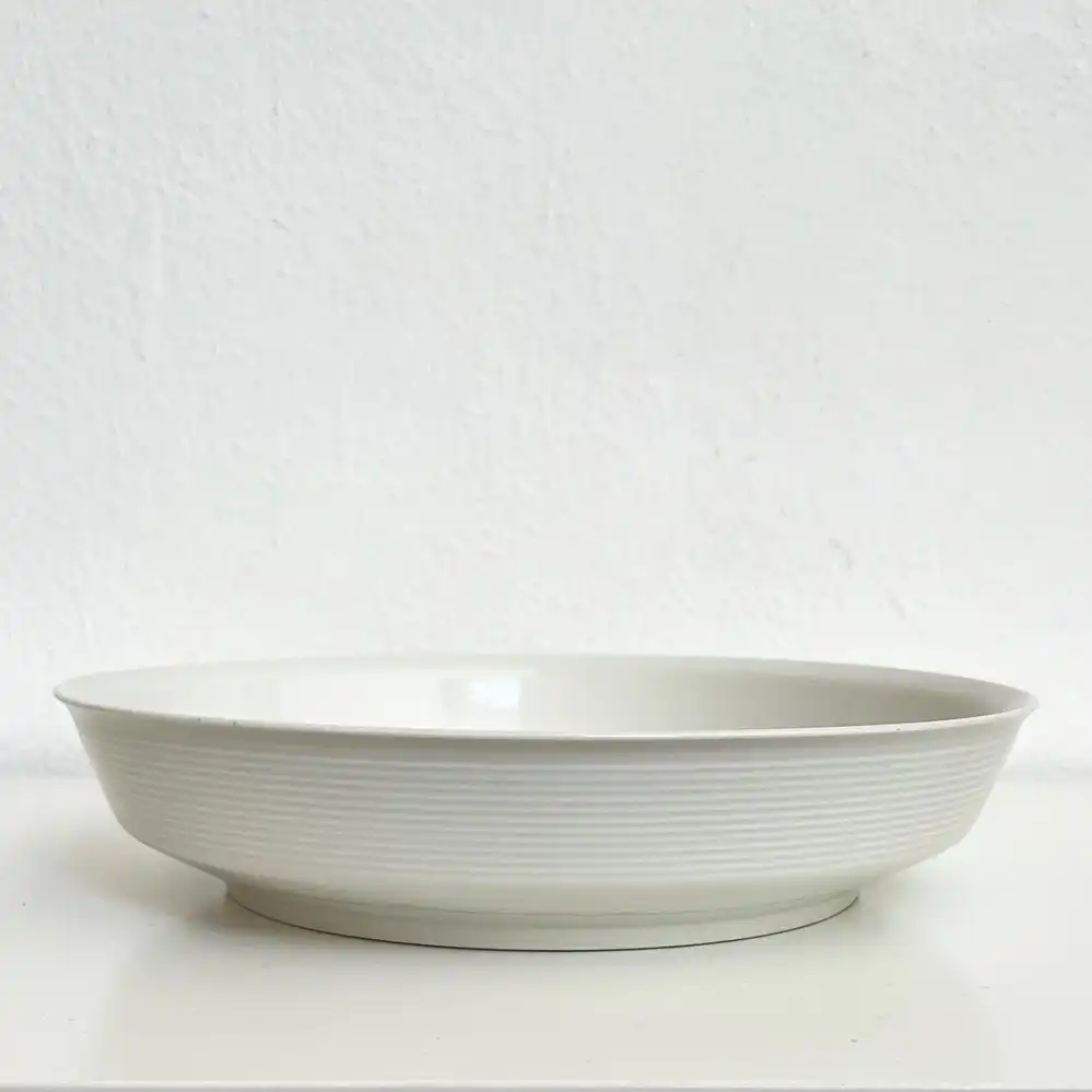 Die 25 cm große flaache Schale oder Schüssel ist Bestandteil des Speiseservice Burg Giebichenstein der KPM. 1930 entwarf Marguerite Friedlaender-Wildenhain an der Burg Giebichenstein das gleichnamige Speiseservice für die KPM in Berlin im Stil der Moderne, es zeichnet sich durch das monochrome Weiß verbunden mit dem Rillendekor aus. Die Terrine war Exponat unserer Ausstellung „Im Zeichen der Burg” 2025 über das Werk von Marguerite Friedlaender.