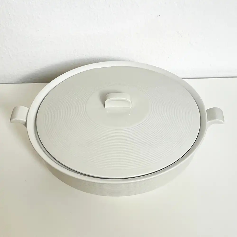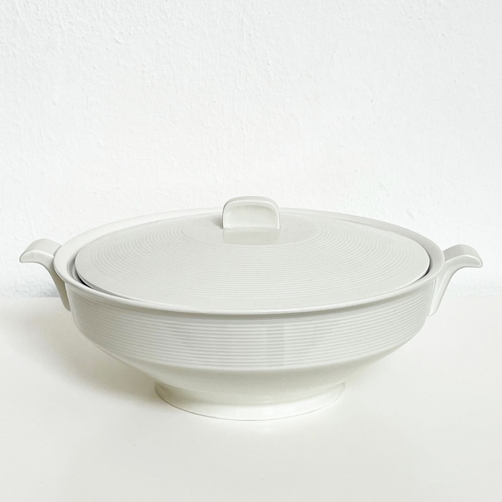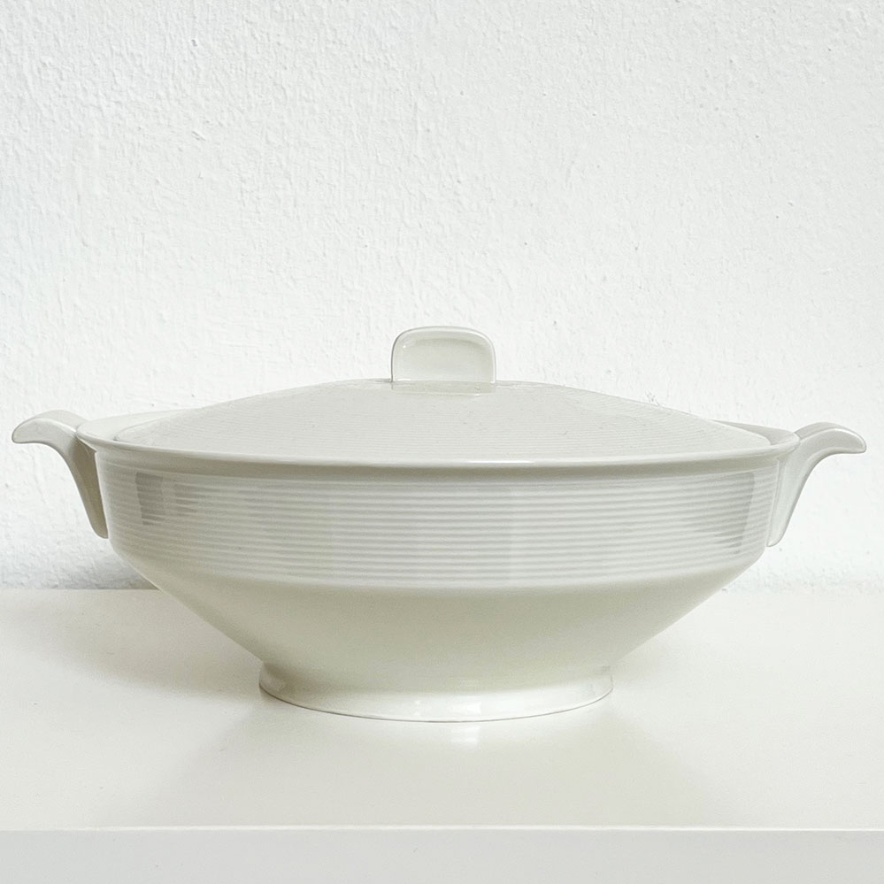 Die seltene Suppenterrine ist Bestandteil des Speiseservice Burg Giebichenstein und formal einer der schönsten Entwurfe aus dem Service. 1930 entwarf Marguerite Friedlaender-Wildenhain an der Burg Giebichenstein das gleichnamige Speiseservice für die KPM in Berlin im Stil der Moderne, es zeichnet sich durch das monochrome Weiß verbunden mit dem Rillendekor aus. Die Terrine war Exponat unserer Ausstellung „Im Zeichen der Burg” 2025 über das Werk von Marguerite Friedlaender.