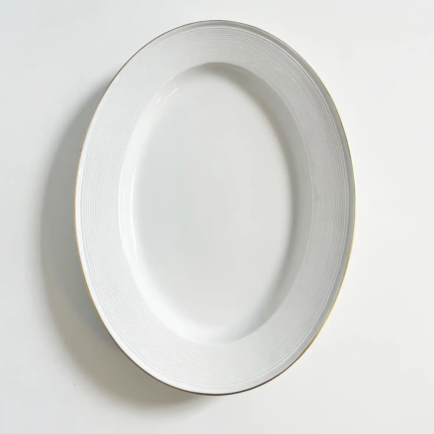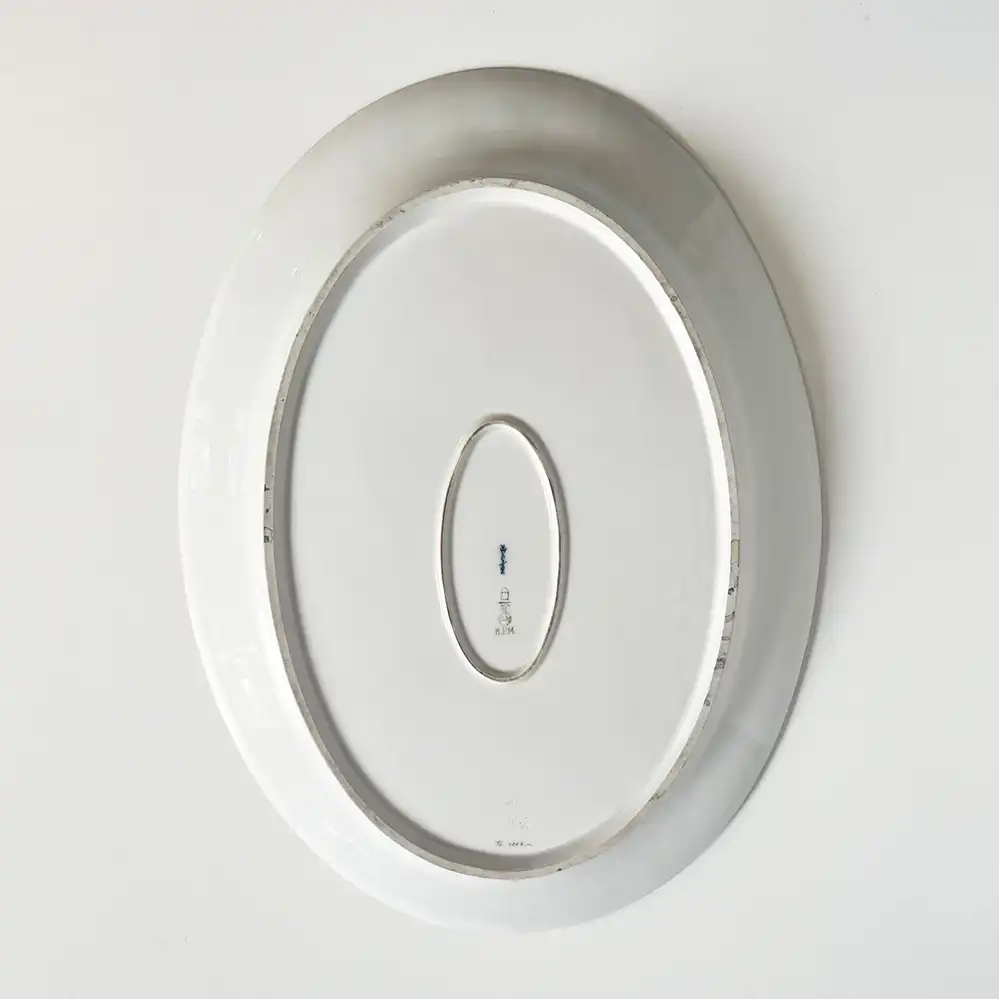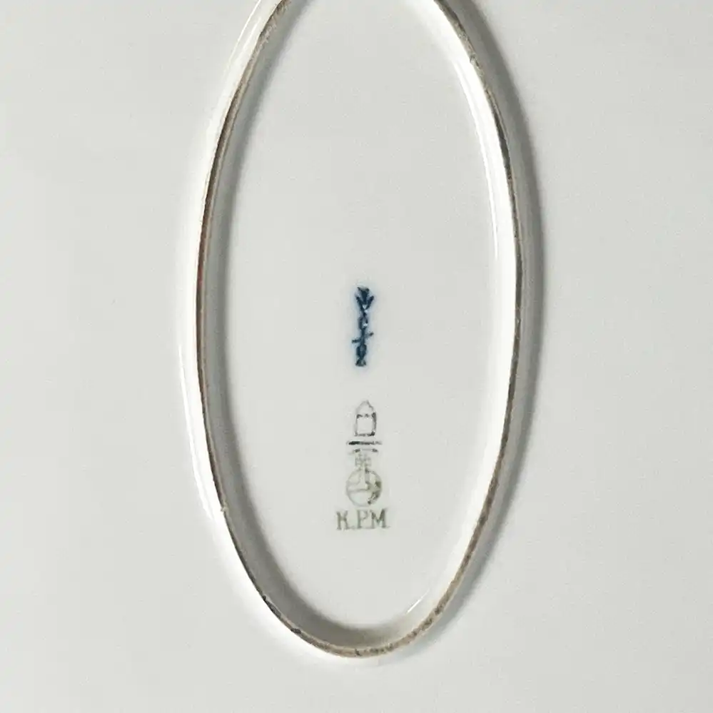Die 44,5 lange KPM-Vorlegeplatte mit Goldrand ist Bestandteil des Speiseservice Burg Giebichenstein und die größte Ausführung der Vorlegeplatten. 1930 entwarf Marguerite Friedlaender-Wildenhain an der Burg Giebichenstein das gleichnamige Speiseservice für die KPM in Berlin im Stil der Moderne, es zeichnet sich durch das monochrome Weiß verbunden mit dem Rillendekor aus.