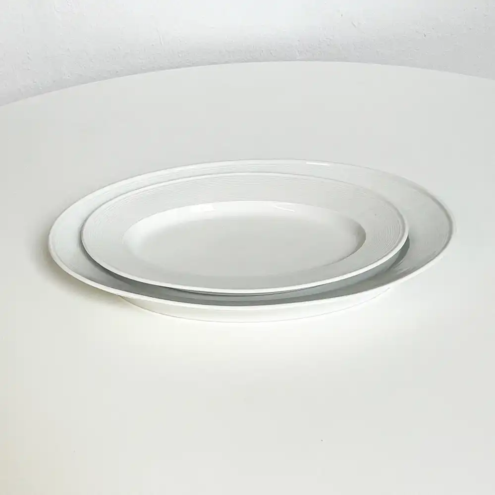 Die große ovale KPM-Vorlegeplatte ist Bestandteil des Speiseservice Burg Giebichenstein und mit 44,5 cm Länge die größte Ausführung der Vorlegeplatten. 1930 entwarf Marguerite Friedlaender-Wildenhain an der Burg Giebichenstein das gleichnamige Speiseservice für die KPM in Berlin im Stil der Moderne, es zeichnet sich durch das monochrome Weiß verbunden mit dem Rillendekor aus. Die beiden letzten Fotos zeigen die 44,5 cm und 34,5 cm Platte zusammen (Preis pro Vorlegeplatte)
