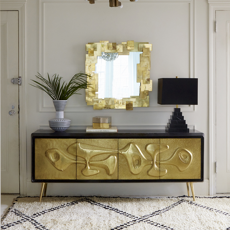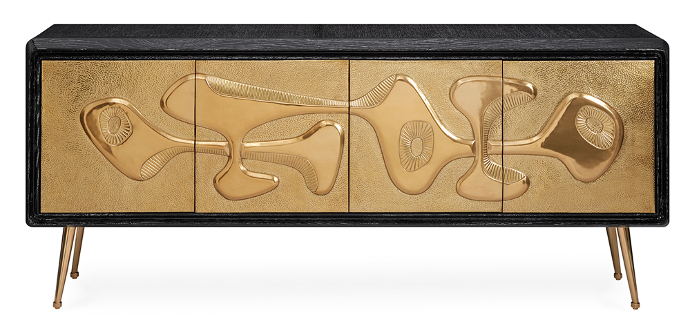 Das Reform Sideboard von Jonathan Adler ist von der brutalistischen Architektur moderner Kirchenbauten inspiriert - von Le Corbusiers Ronchamp Kirche über die israelische Synagoge Tempel in Miami bis zu Oscar Niemeyers Kathedrale in Brasilia. Die Ornamentik der Türen ist dabei von den Reform Vasen von Jonathan Adler abgeleitet und entstand im Designcenter von in Soho. Dabei wird die Ornamentik auf die zwei Doppeltüren geschnitzt und mit einem Messingblech verkleidet, das von Hand gehämmert und poliert wird. Der arbeitsintensive Prozess dauert pro Tür acht bis zwölf Stunden – ein Highlight der Handwerkskunst.