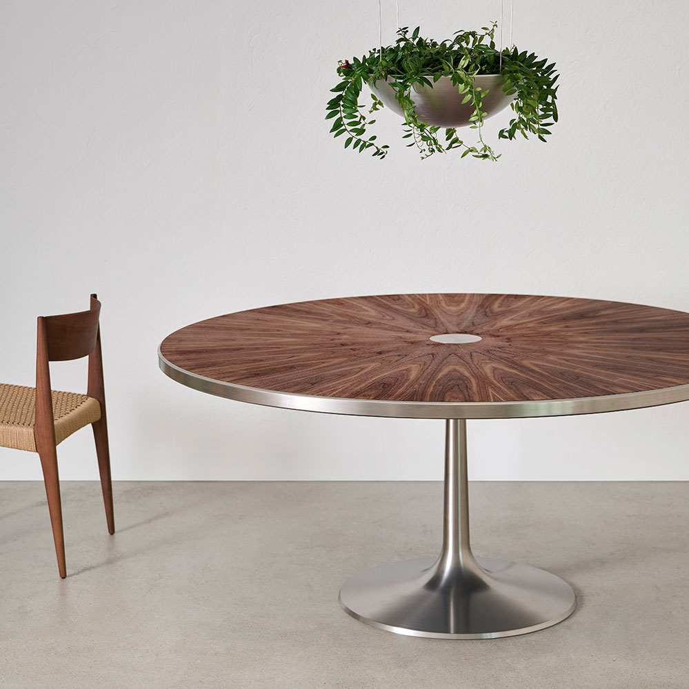 Ein Traum von einem Esstisch ist der Cadovius Table 630 von dem gleichnamigen dänischen Designer aus dem Jahr 1968, mit seinem exquisiten Säulenfuß und dem subtilen Rand aus Edelstahl wirkt der Tisch fast einer Skulptur. Bei näherer Betrachtung des Tisches offenbart der Rand eine bemerkenswerte Tischplatte mit einem spektakulären Muster aus furniertem Holz.