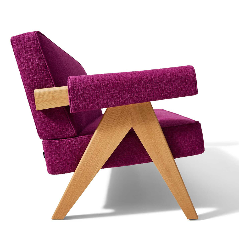 Ebenso wie den Armlehnsessel Capitol Complex Armchair entwarf Pierre Jeanneret 1960 das gleichnamige kleine Sofa für den Kapitol-Komplex der indischen Stadt Chandigarh. Diese Planstadt wurde ab den 1950er Jahren von Le Corbusier entworfen und zählt heute zum UNESCO-Weltkulturerbe. Der Architekt Pierre Jeanneret überwachte 15 Jahre die Planung der heutigen Millionenstadt und schuf einzelne Gebäude, dabei entwarf er auch die gesamte Möblierung mit Hilfe von lokalen Arbeitern, die dann die meist scherenförmigen Teakholzmöbel vor Ort produzierten. Das heutige Capitol Complex Sofa von Cassina ist wahlweise in Teak, Eiche natur, Eiche schwarz gebeizt oder Eiche Nussbaum-farbig gebeizt erhältlich.