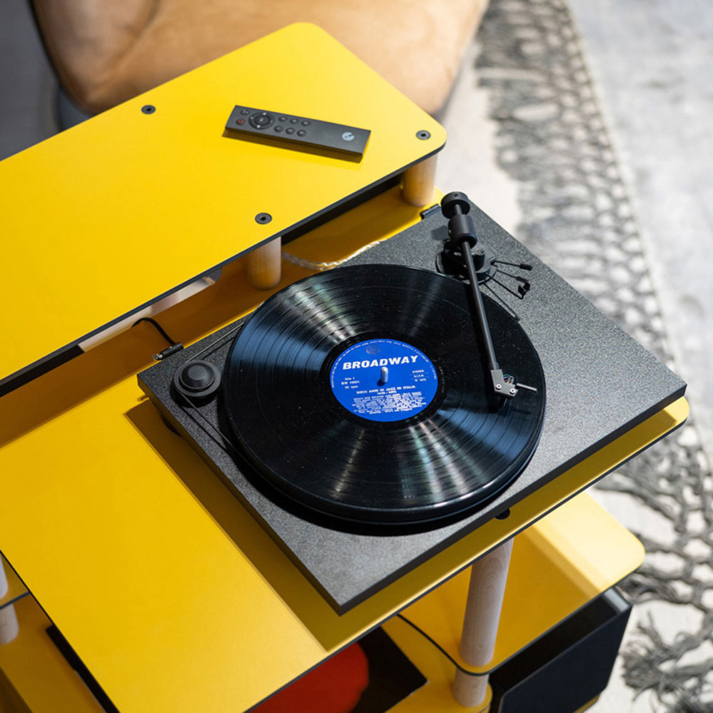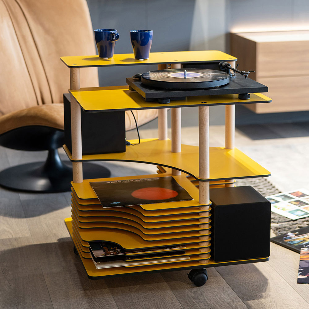 Joe Colombo war großer Musikliebhaber, seine Leidenschaft galt dem Jazz. Da war es natürlich naheliegend, dass der auch eine Aufbewahrung für seine Stereoanlage und Schallplattensammlung konzipierte. Carrello Musica entstand im Jahr 1968, als Colombo anlässlich eines von Rinascente (ein Shoppingcenter in Mailand) veranstalteten Wettbewerbs ein neues Produkt entwerfen sollte. Codiceicona legte den unbekannten Entwurf in Zusammenarbeit (die letzte Abbildung zeigt das Original aus den 1960er Jahren) mit dem Architekten Ignazia Favata vom Studio Joe Colombo in zwei Farben wieder auf.