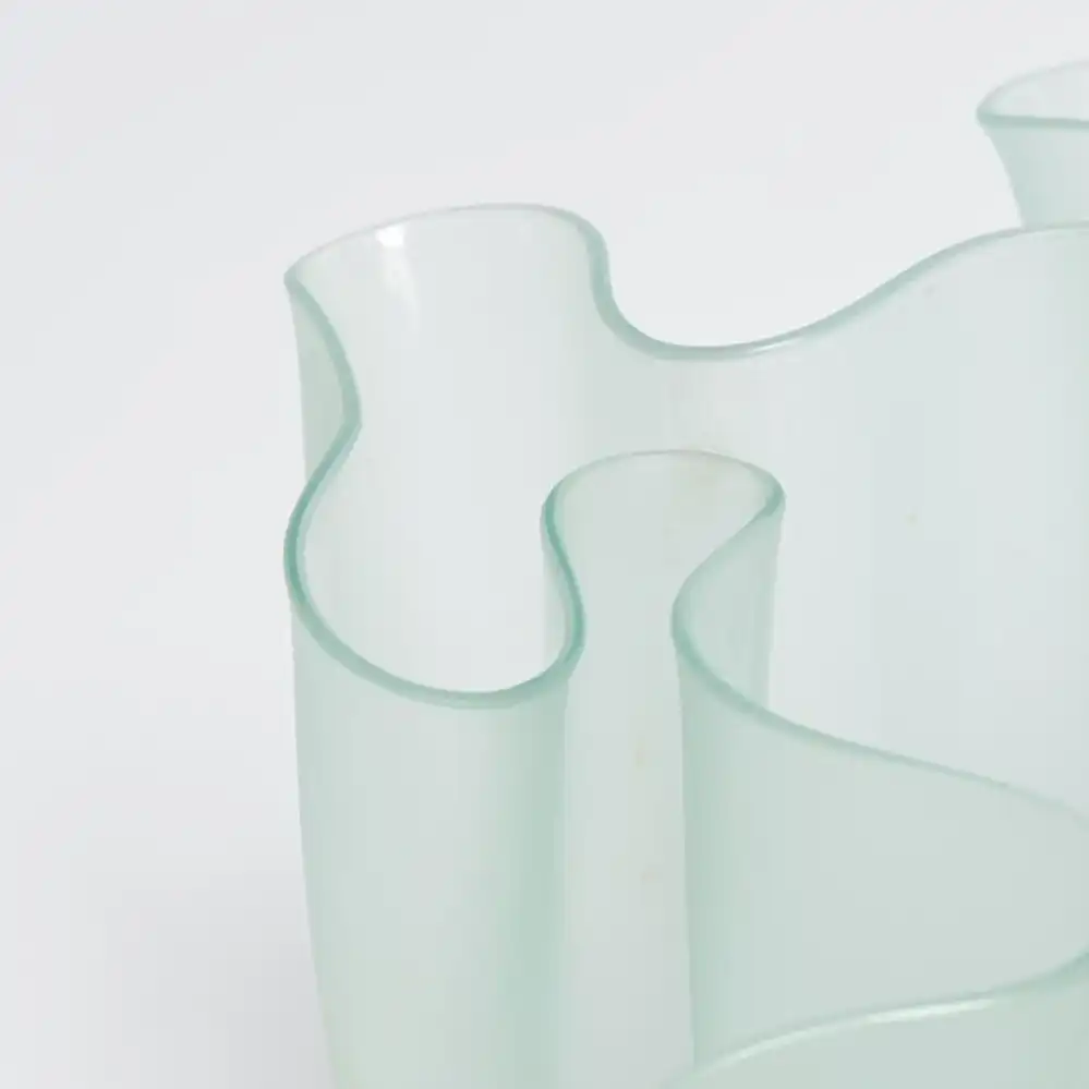 Die Cartoccio Vase ist ein Entwurf von Pietro Chiesa, dem Mitbegründer von Fontana Arte, aus dem Jahr 1932. Ähnlich wie bei der Savoy Vase von Alvar Aalto wurden hier organische Formen neu interpretiert. Das letzte Foto zeigt eine historische Fontana Arte Anzeige aus der Zeitschrift Domus aus dem Jahr 1935. Erhältlich ist die Cartoccio Vase von Fontana Arte aus opalem, matt satinierten Glas.
