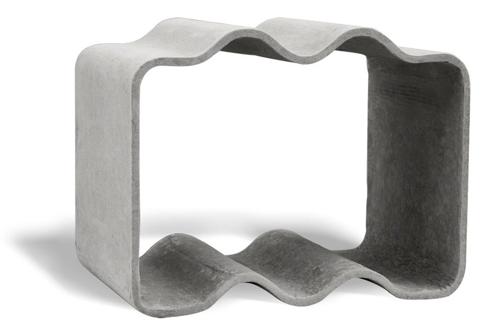 Das Design des multifunktionalen Regalsystems Cheers aus Zement ist eine Hommage an die sogenannte Swisspearl-Welle. Ursprünglich zur Aufbewahrung von Weinflaschen konzipiert, kann man von Holzscheiten bis Handtüchern alles Mögliche darin aufbewahren.