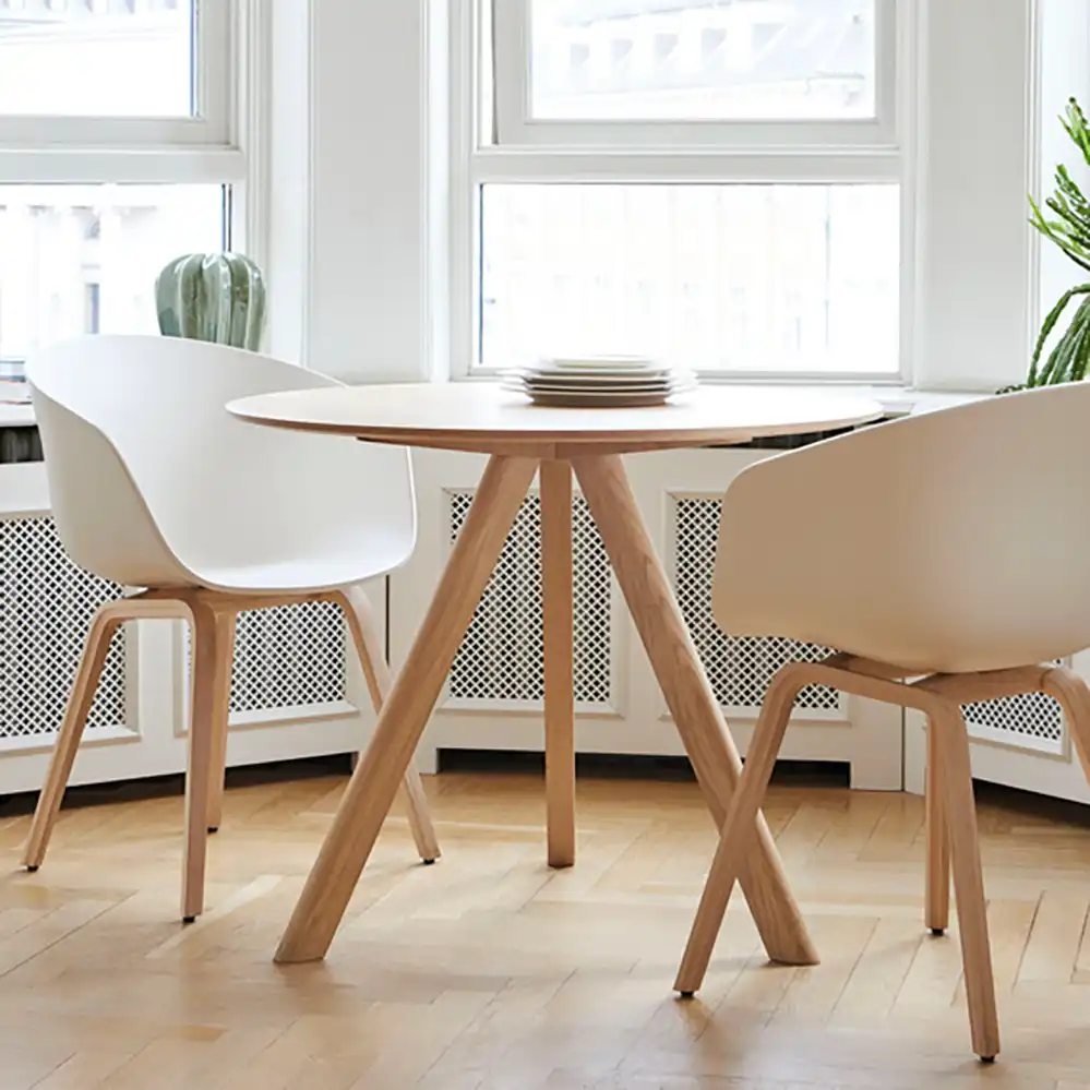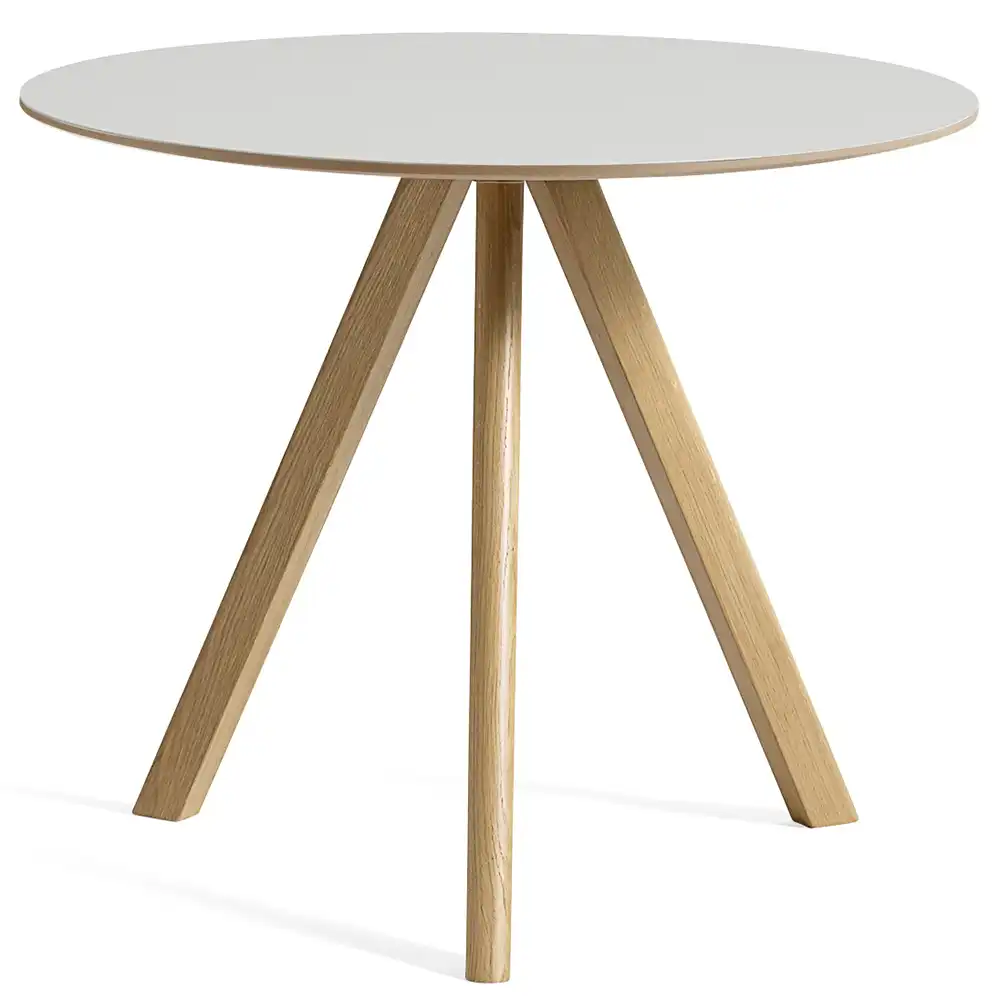 Der CPH 20 Tisch aus der Copenhague-Serie von Ronan und Erwan Bouroullec zeichnet sich durch die charakteristischen schrägen Beine und eine runde Tischplatte aus, die dem klaren Design eine weiche Note verleiht. Das dreibeinige Gestell sorgt für Stabilität und eine elegante Silhouette. Die von uns angebotene Ausführung kombiniert ein Gestell aus massiver Eiche mit einer Tischplatte wahlweise in Eichenfurnier oder Linoleum in verschiedenen Farbvarianten. Dank seiner Vielseitigkeit eignet sich der CPH 20 sowohl für kleine Besprechungen als auch für Café-ähnliche Umgebungen und fügt sich harmonisch in private Wohnräume wie in öffentliche Bereiche ein.