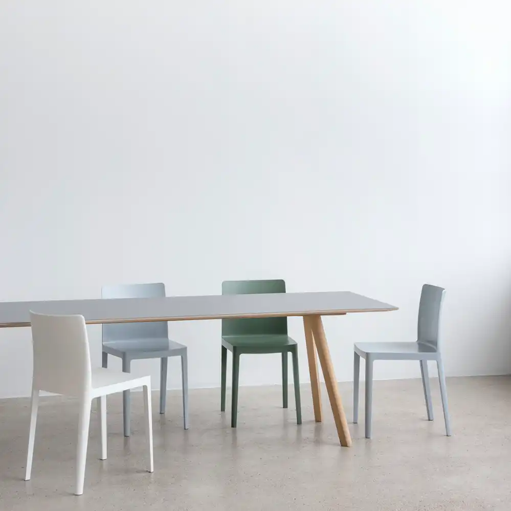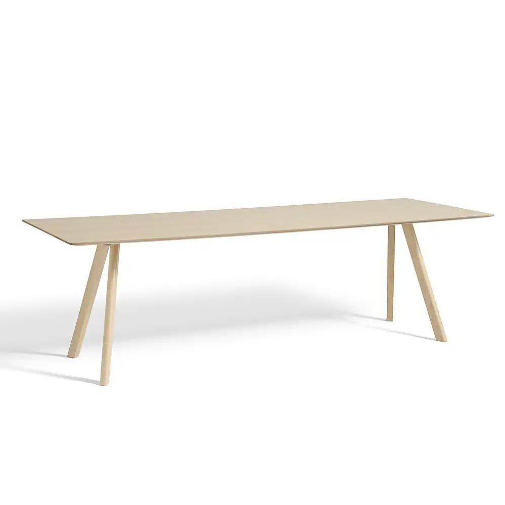 Als Teil der Copenhague-Serie von Ronan und Erwan Bouroullec überzeugt der CPH 30 mit der charakteristischen klaren Formensprache und den markanten, schräg gestellten Beinen der Kollektion. Diese Variante verfügt über eine rechteckige Tischplatte und ist in verschiedenen Größen erhältlich. Die von uns angebotene Ausführung kombiniert ein Gestell aus massiver Eiche mit einer Tischplatte wahlweise in Eichenfurnier oder Linoleum in unterschiedlichen Farbvarianten. Die Kombination aus natürlichem Holz und der eleganten, pflegeleichten Oberfläche macht den CPH 30 zu einer vielseitigen Lösung für Büros, Konferenzräume oder den privaten Essbereich.