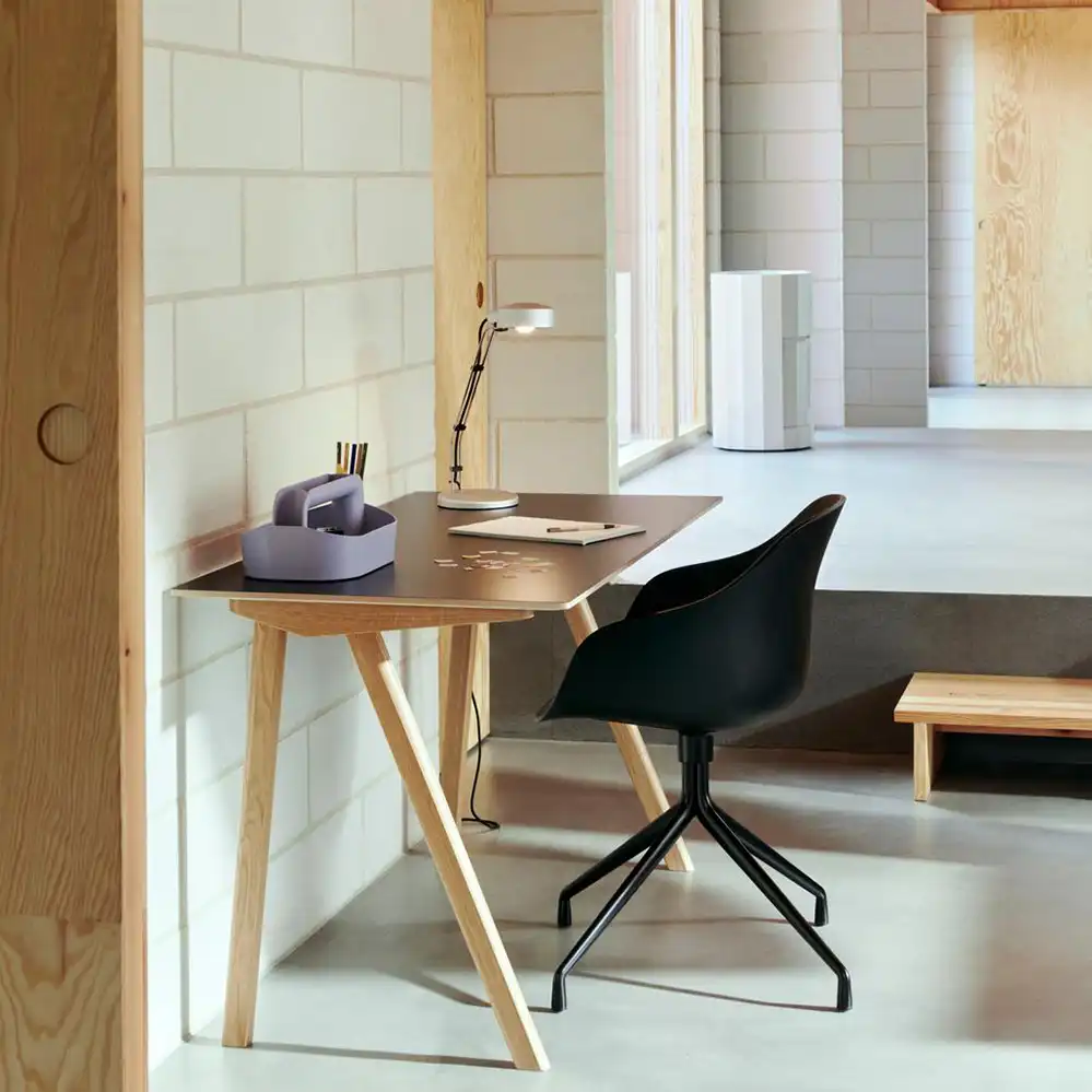 Der CPH 90 bringt klassische Schreibtischästhetik in einen modernen Kontext. Die asymmetrischen Beine der Bouroullec-Brüder in Kombination mit der schlanken Tischplatte ergeben ein funktionales, kompaktes und klares Design. Die von uns angebotene Variante ist in Eiche, mit einer Tischplatte wahlweise in Eichenfurnier oder Linoleum. Dank seiner eleganten und vielseitigen Gestaltung eignet sich der CPH 90 sowohl für den Einsatz im Büro als auch für das Arbeiten zu Hause.