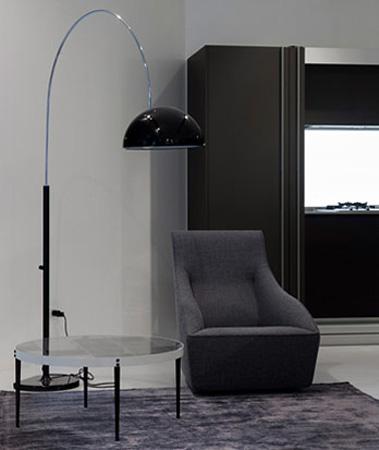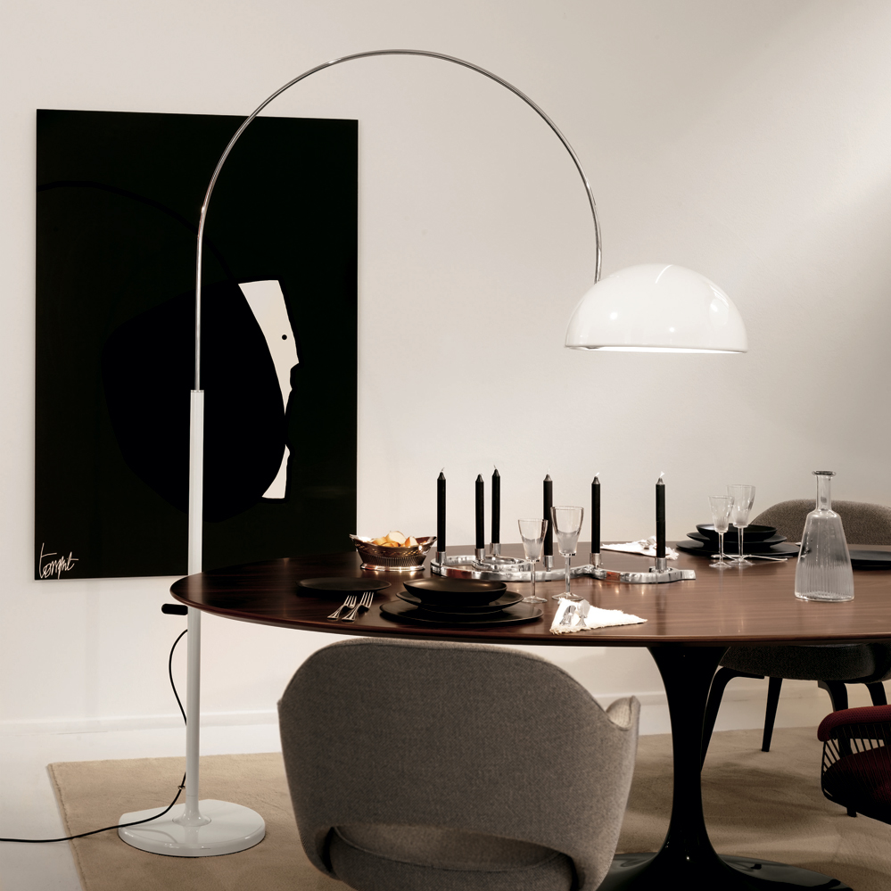 Die höhenverstellbare Bogenleuchte Coupé mit dem markanten Schlitz im Reflektor entwarf Joe Colombo im 1967 für Oluce, durch den seitlichen Kunststoffgriff kann die Leuchte vertikal und horizontal verstellt werden. Die Bodenplatte ist an einer Seite abgeschnitten, um so die Leuchte direkt an einer Wand platzieren zu können. Die Idee der Bogenleuchte stammt dabei ursprnglich von den Castiglioni Brüdern, die mit der Arco Bogenleuchte für Flos die erste Leuchte dieser Art entwarfen