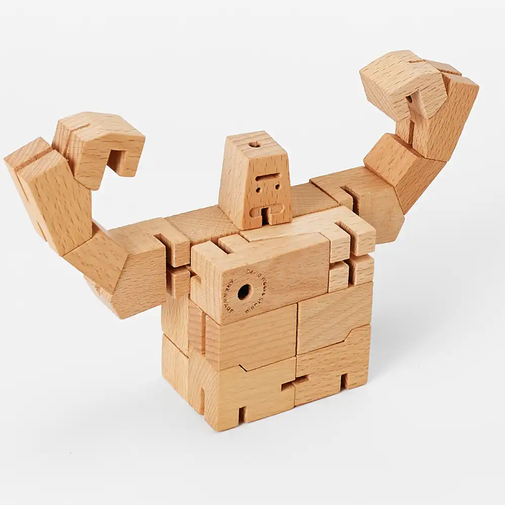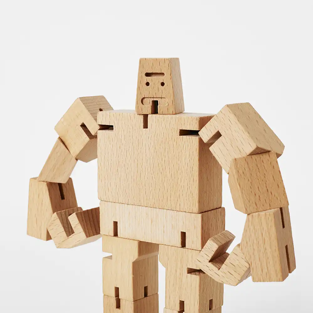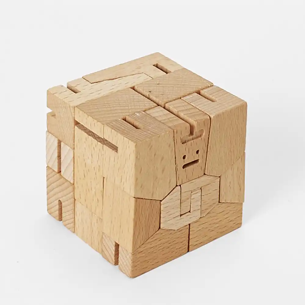 Der Cubebot Medium oder Guthrie ist ein Spielzeugroboter aus Buchenholz, der von japanischen Shinto-Kumi-ki-Puzzles inspiriert ist. Cubebot besteht aus Holz und elastischem Material und kann in Dutzende von Posen gebracht werden. Wenn es Zeit ist, sich auszuruhen, faltet sich Cubebot wieder zu einem perfekten Würfel zusammen. Ein klassisches Spielzeug für alle Altersgruppen, das Generationen von Spielern überdauern wird.
