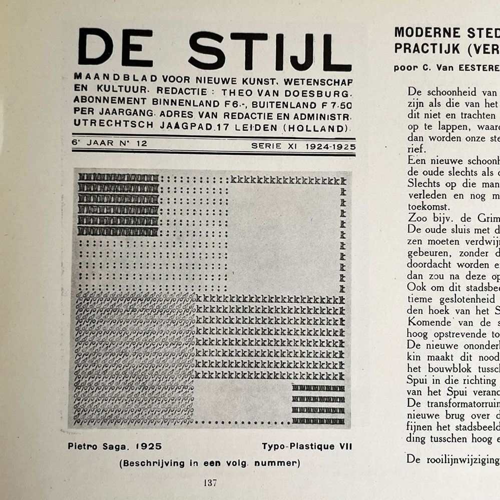 Die vorliegende Ausgabe stammt aus dem Jahr 1924/1925 und beinhaltet u.a. Arbeiten von Pierto Saga, Theo von Doesburg und Gerrit Rietveld (die erste redaktionelle Erwähnung des Rietveld-Schröder-Haus in Utrecht).