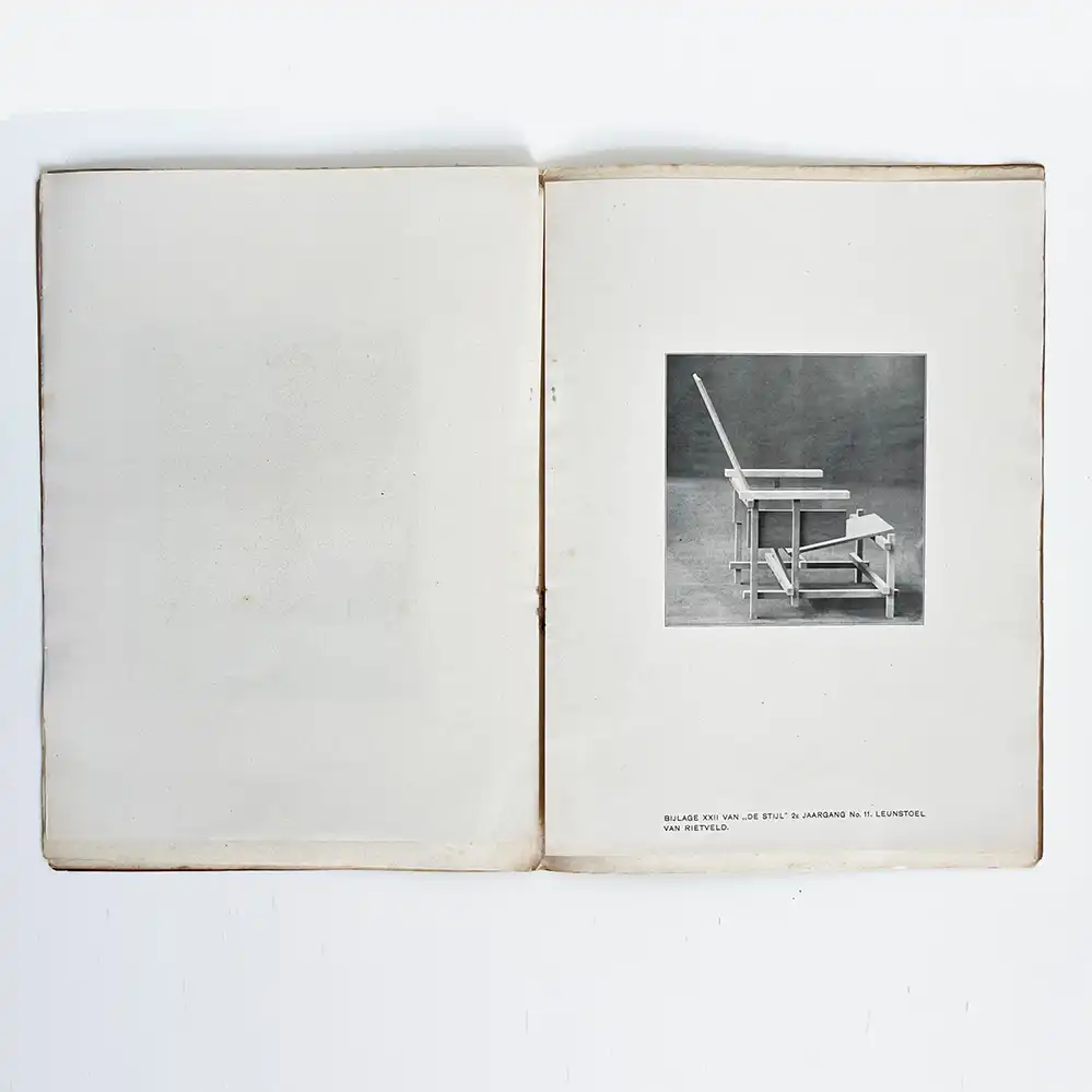 1917 erschien die erste Ausgabe des De Stijl Magazins mit dem ersten Holzschnitt-Signet nach dem Entwurf von Vilmos Huszár, die Typografie stammt wohl von Theo van Doesburg. Die vorliegende Ausgabe stammt aus dem Jahr 1918 und enthält wohl eine der ersten Abbildungen des Red-Blue-Chair von Gerrit Rietveld überhaupt (lose Bildtafel). Zusätzlich enthält die Ausgabe eine zweite Bildtafel (?) der Komposition VOLLERSRODA III von Lyonel Feininger aus dem Jahr 1916 (speciaal voar De Stijl)