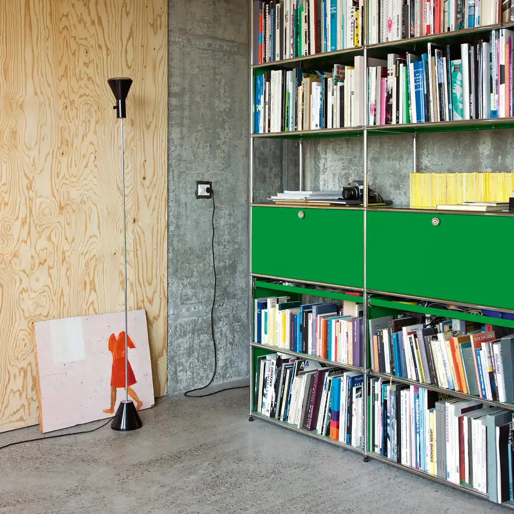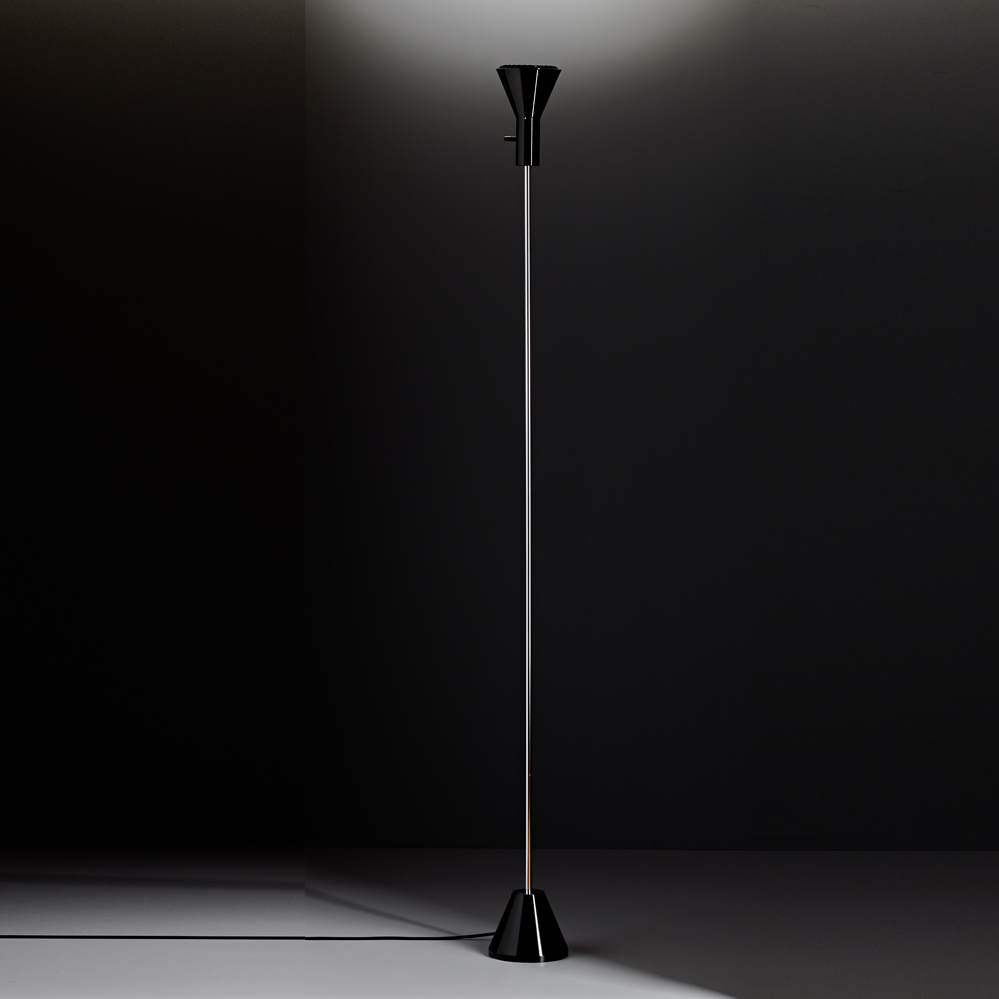 Egon Eiermann entwarf die reduzierte Stehleuchte ursprünglich für den deutschen Pavillon zur Weltausstellung 1958 in Brüssel. Seit 2014 wird der dimmbare Deckenstrahler von Tecnolumen in der LED-Variante und in vier Farben produziert.