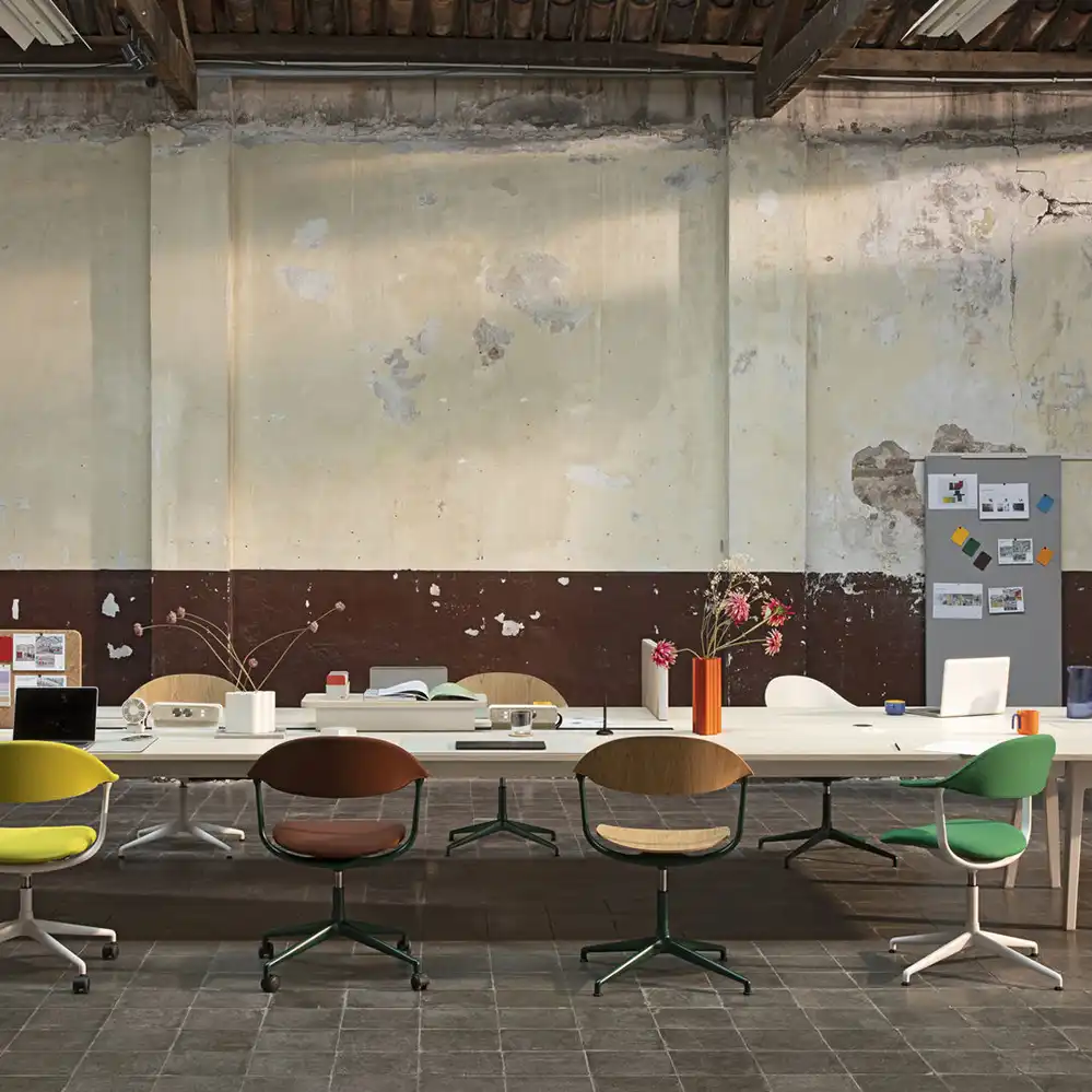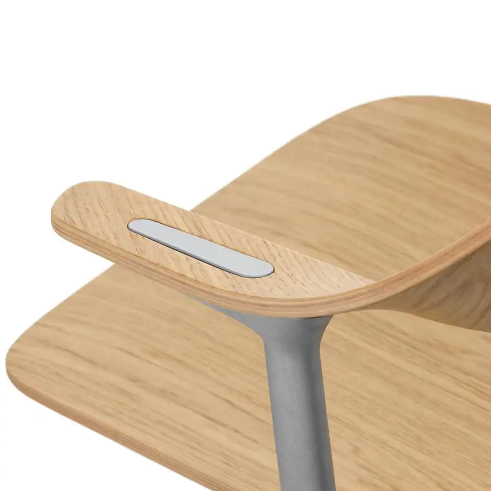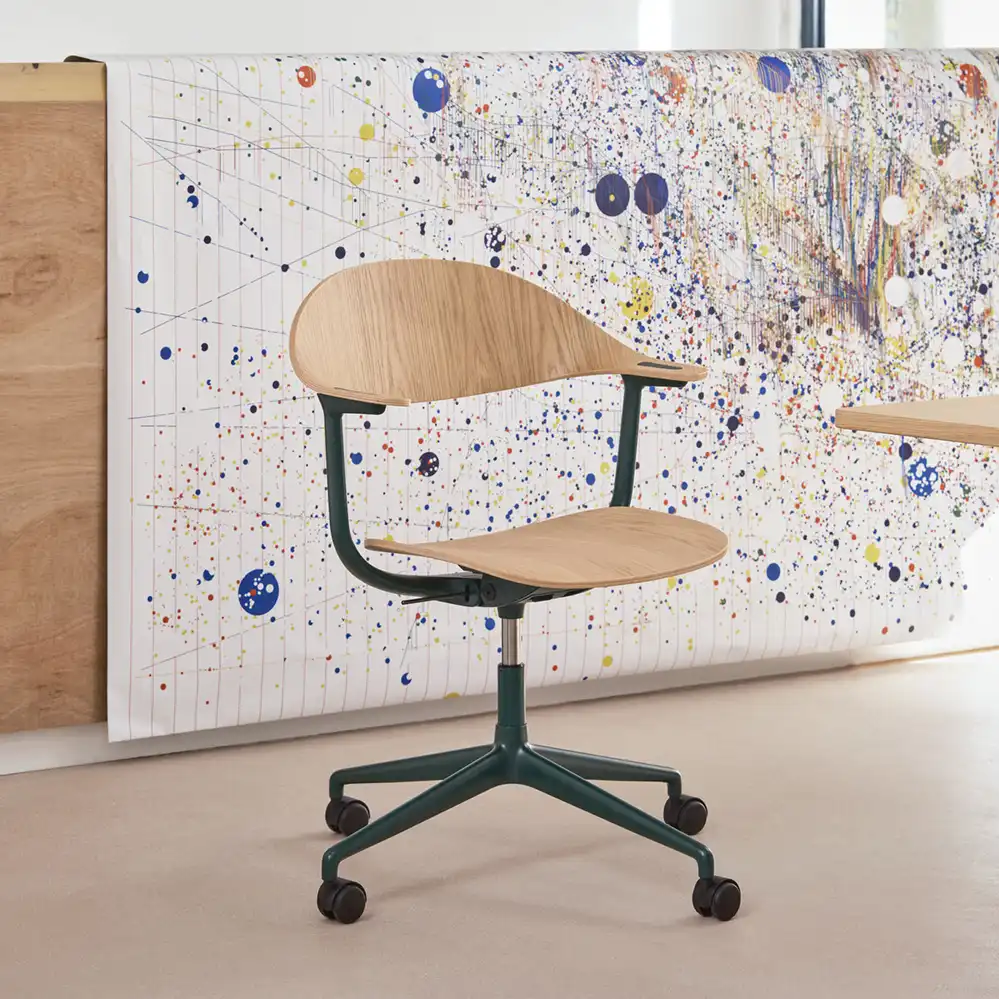 Die hier offerierte Variante des Mynt Drehstuhls mit dem neuen Viersternefußverfügt über einen Sitz- und Rücken aus Eiche-Furnier. Zusätzlich ist der Stuhl alternativ mit Kunstoffsitz/Rücken und optionaler Polsterung bei Vitra erhältlich. Der Fußuntersatz ist wahlweise mit und ohne Rollen verfügbar.