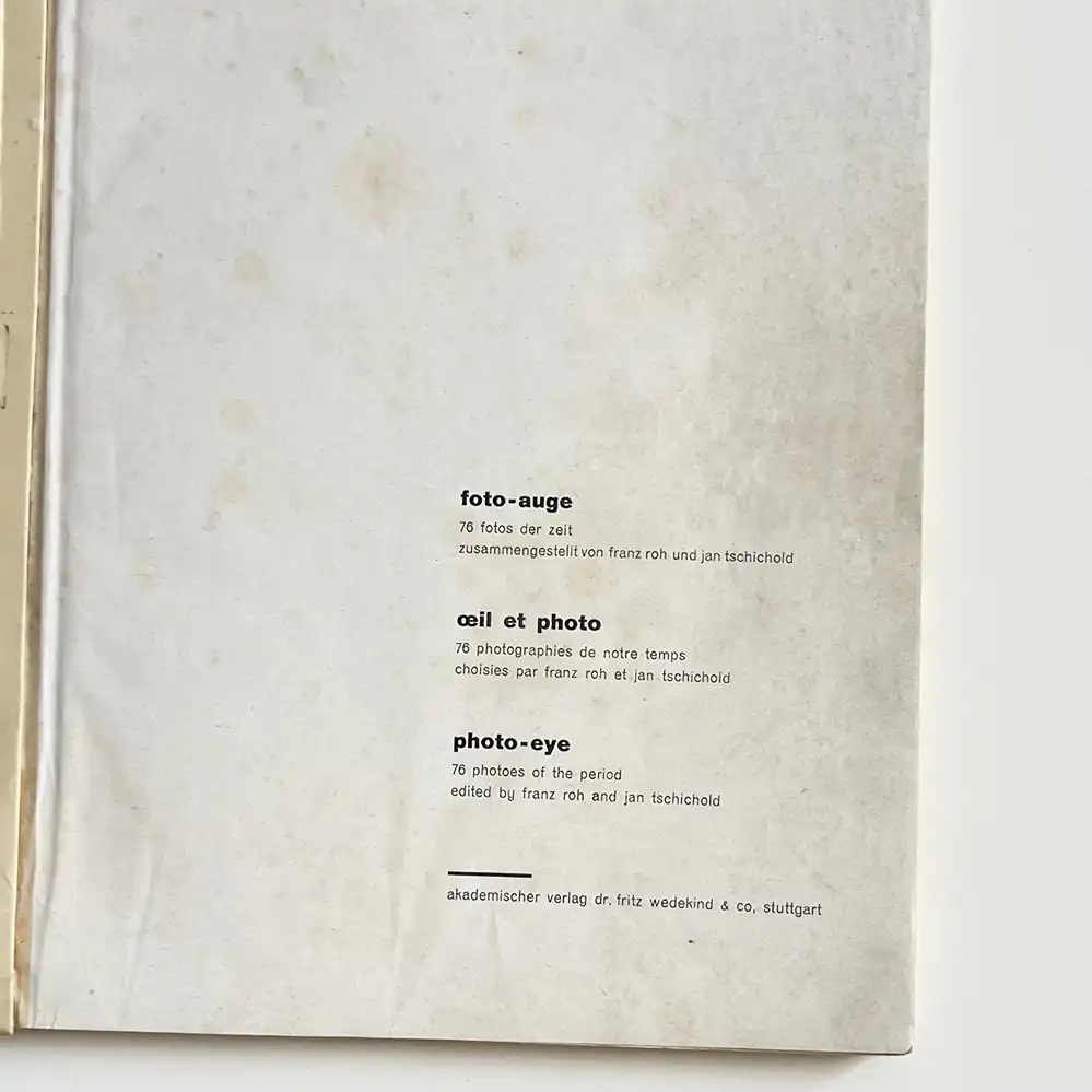 Das von Jan Tschichold zusammengestellte und gestaltete Buch „Foto-Auge” gilt als eines der wichtigsten Fotobücher der 1920er Jahre. Das berühmte Cover zeigt eine Fotomontage von El Lissitzky, das Buch umfasst Arbeiten von Willi Baumeister, Herbert Bayer, Max Ernst, Andreas Feininger, George Grosz, John Heartfield, Laszlo Moholy-Nagy, Man Ray oder Albert Renger-Patzsch und anderen Künstlern..