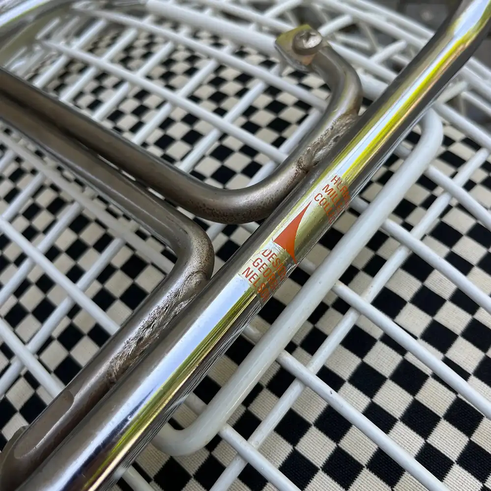 Der hier angebotene Wire Chair stammt aus der Produktion von Herman Miller aus den 1960er oder 70er Jahren, der sogenannte Bikini-Bezug in Checker Bezug von Alexander Girard aus der aktuellen Vitra Produktion. Der Stuhl ist fälschlicherweise von unten mit „Herman Miller Collection, Design George Nelson" gelabelt, ein Fehler, der leider bei alten Möbeln von Herman Miller häufig zu finden ist.