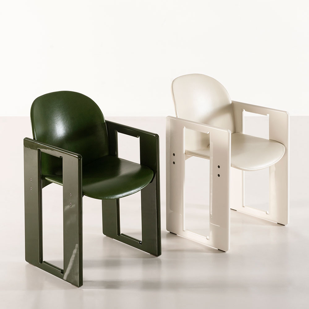20225 legte Tacchini den Dialogo Chair mit einer gänzenden Lackierung in Weiß oder Dunkelgrün auf. Den archaisch wirkenden Armlehnstuhl entwarf Tobia Scarpa im Jahr 1973, 2023 wurde der Stuhl von Tacchini 50 Jahre nach dem Entwurf wieder aufgelegt (das letzte Foto zeigt historische Stühle!). Erhältlich ist Dialogo wahlweise mit und ohne Armlehnen (auf Anfrage), als Sitzpolsterung bieten wir den italienischen Klassiker in dem Anilinleder von Tacchini an, da das Leder für uns am besten zu dem Stuhl passt. Erhältlich ist Dialogo zusätzlich in Esche dunkelgrau, Esche Nussbaumfarbig oder aus italienischen Nussbaum (siehe unten).