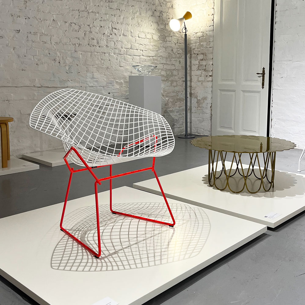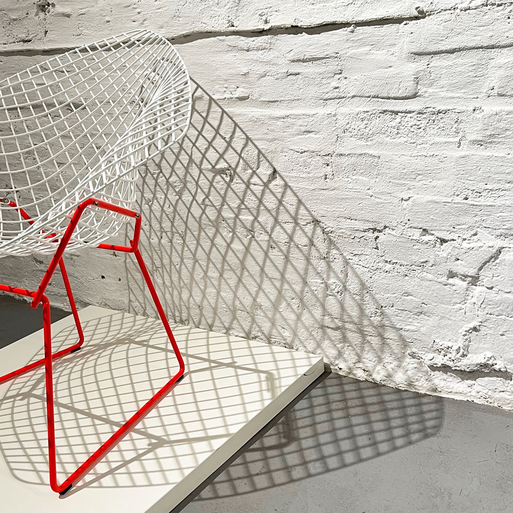 Zu unserem 25jährigen Jubiliäum 2024 legten wir zusammen mit Knoll International den Bertoia Diamond Sessel in einer ganz kleinen Edition von fünf Exemplaren in einer ganz besonderen Ausführung auf. Während die Schale des Drahtgittersessels weiß lackiert ist, präsentiert sich das Gestell in einem neonleuchtenden Korallenrot in „Knoll Red”. Diese Farbinterpretation lässt den amerikanischen Mid Century Modern Designklassiker aus den 1950er Jahren noch mehr wie ein Kunstobjekt wirken (der Sessel ist auch als ein Werk der angewandten Kunst geschützt).