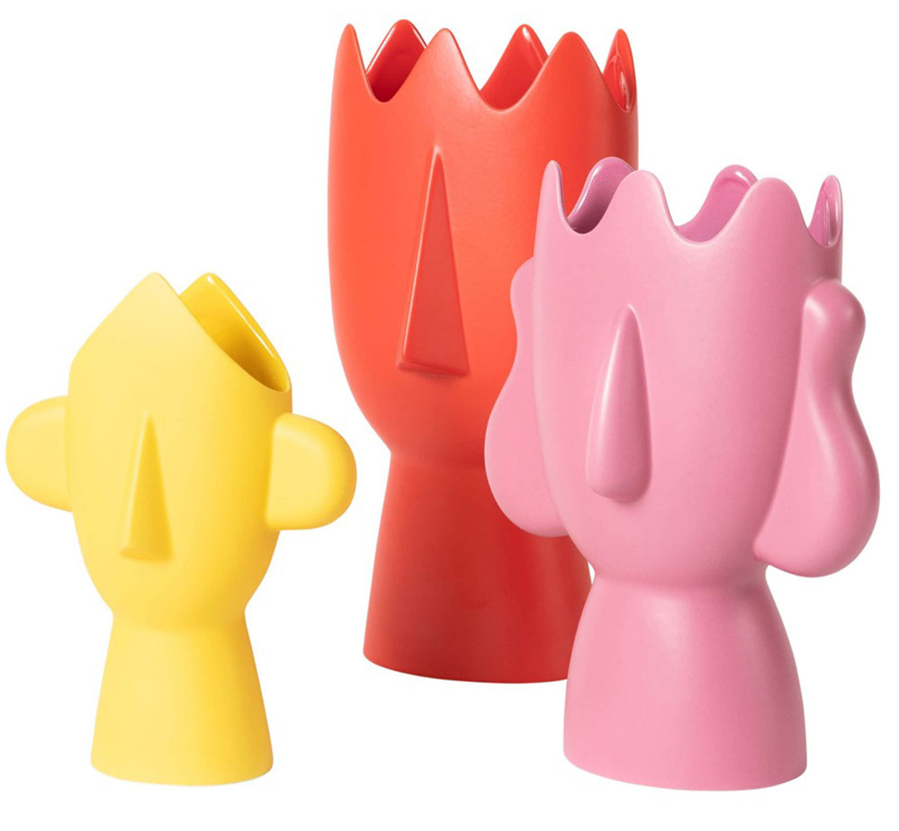 Die drei Diavoletti Keramiken sind ein Entwurf von Daniel Eltner und Alessandro Mendini aus dem Jahr 2018. Die Formgebung ist von der alten Zykladenkultur der Insel Mykonos inspiriert. Jede der in Handarbeit hergestellten drei Vase hat dabei eine unterschiedliche Farbgebung.